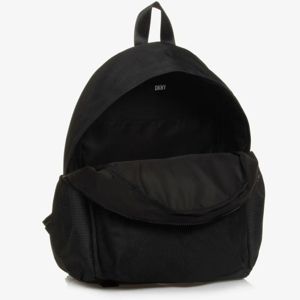 Black backpack for boys and girls by American label DKNY, made in textured canvas for durability. Super stylish and practical, this zip-up bag has bright white logo graphics and multiple inner and outer pockets, some made in mesh, for all their essentials. Lined with smooth fabric, it has a top carry handle and a padded, breathable mesh back, with subtle logo embossing for extra designer appeal. The shoulder straps are adjustable and padded for comfort.