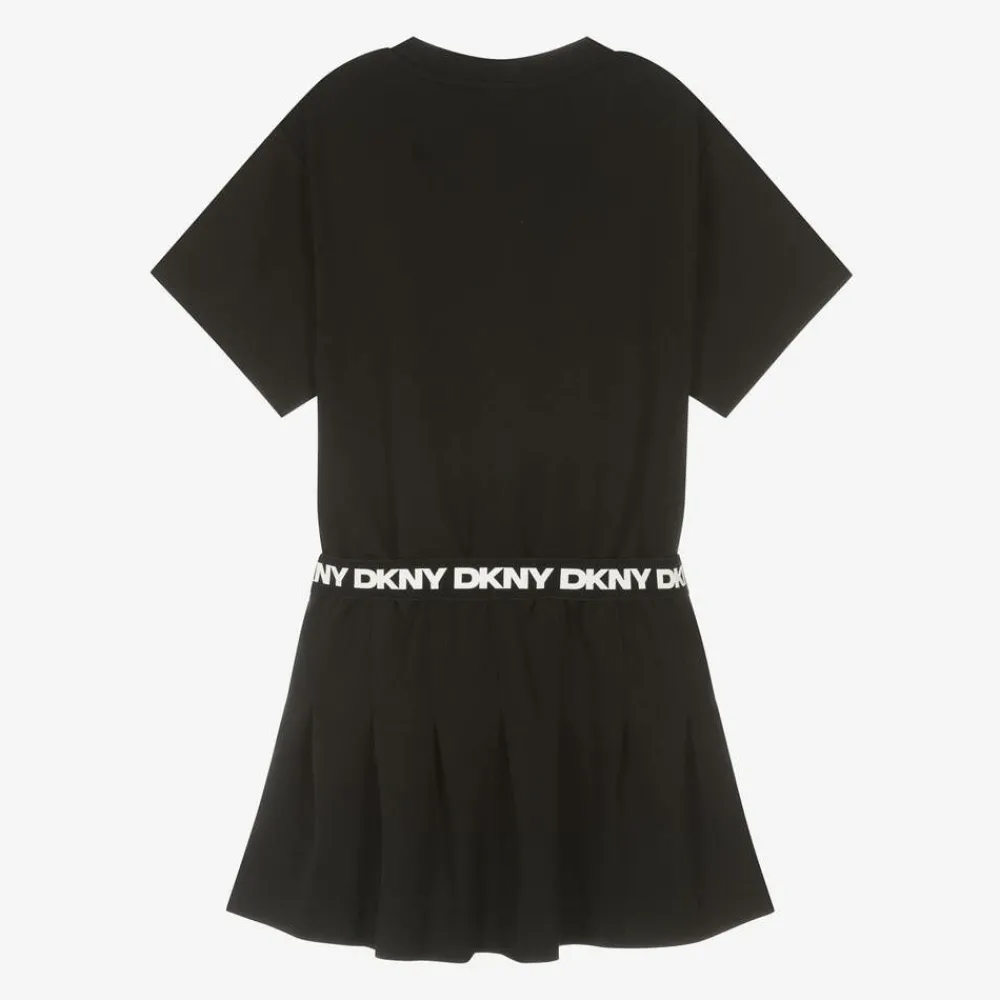 A black short-sleeved dress for girls by DKNY. The T-shirt-style bodice is made from soft Milano jersey and is printed with a bold white logo on the chest for a signature look. In a cool dropped-waist style, it has a pleated twill skirt with a repeat logo-detailed elasticated waistband for comfortable wear.