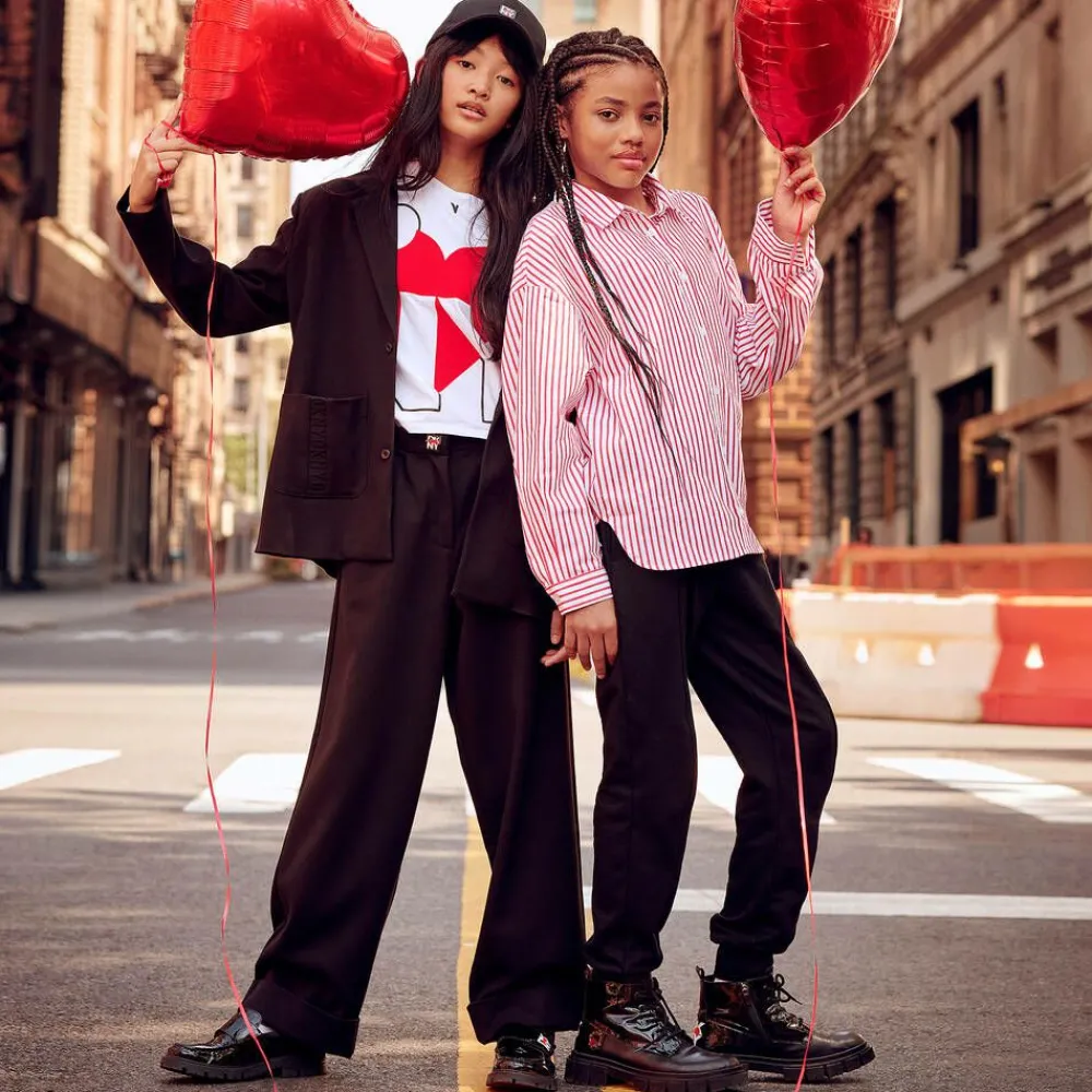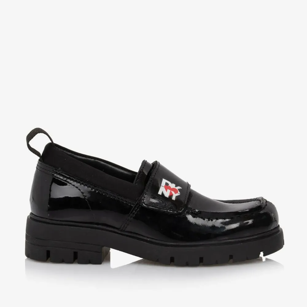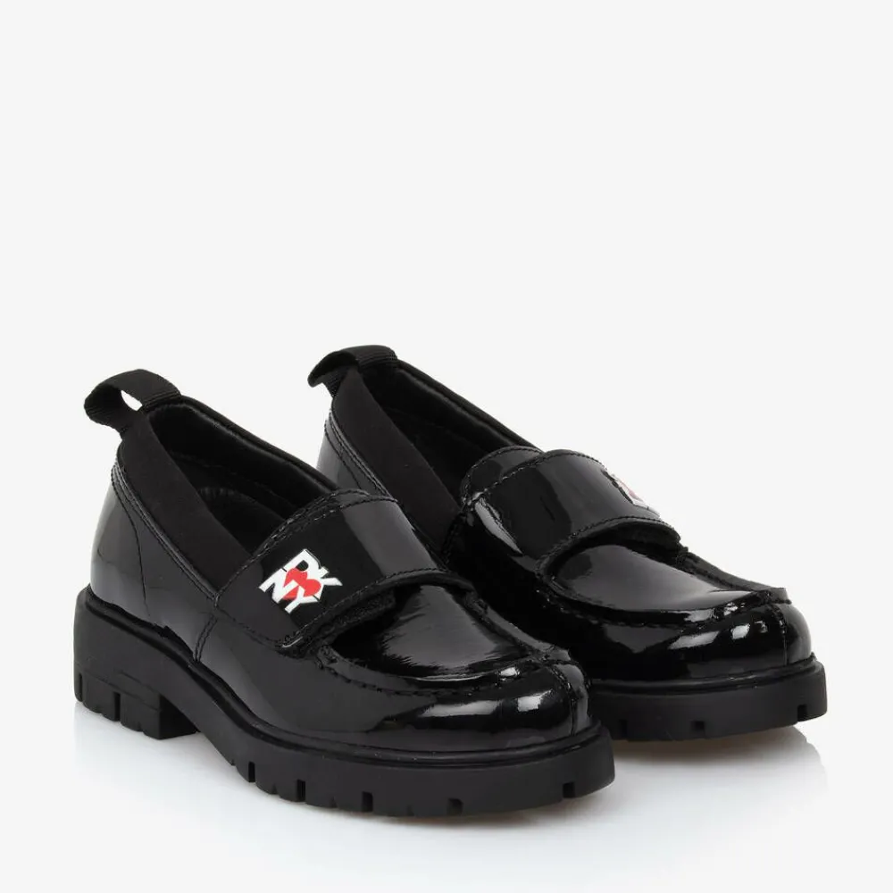 Black patent leather loafers for girls by DKNY, branded with The Heart of NY logo for iconic style. These glossy shoes have a velcro strap across the foot and a grosgrain pull tab on the back of the heel. They are lined with soft leather and finished with a chunky non-slip sole.