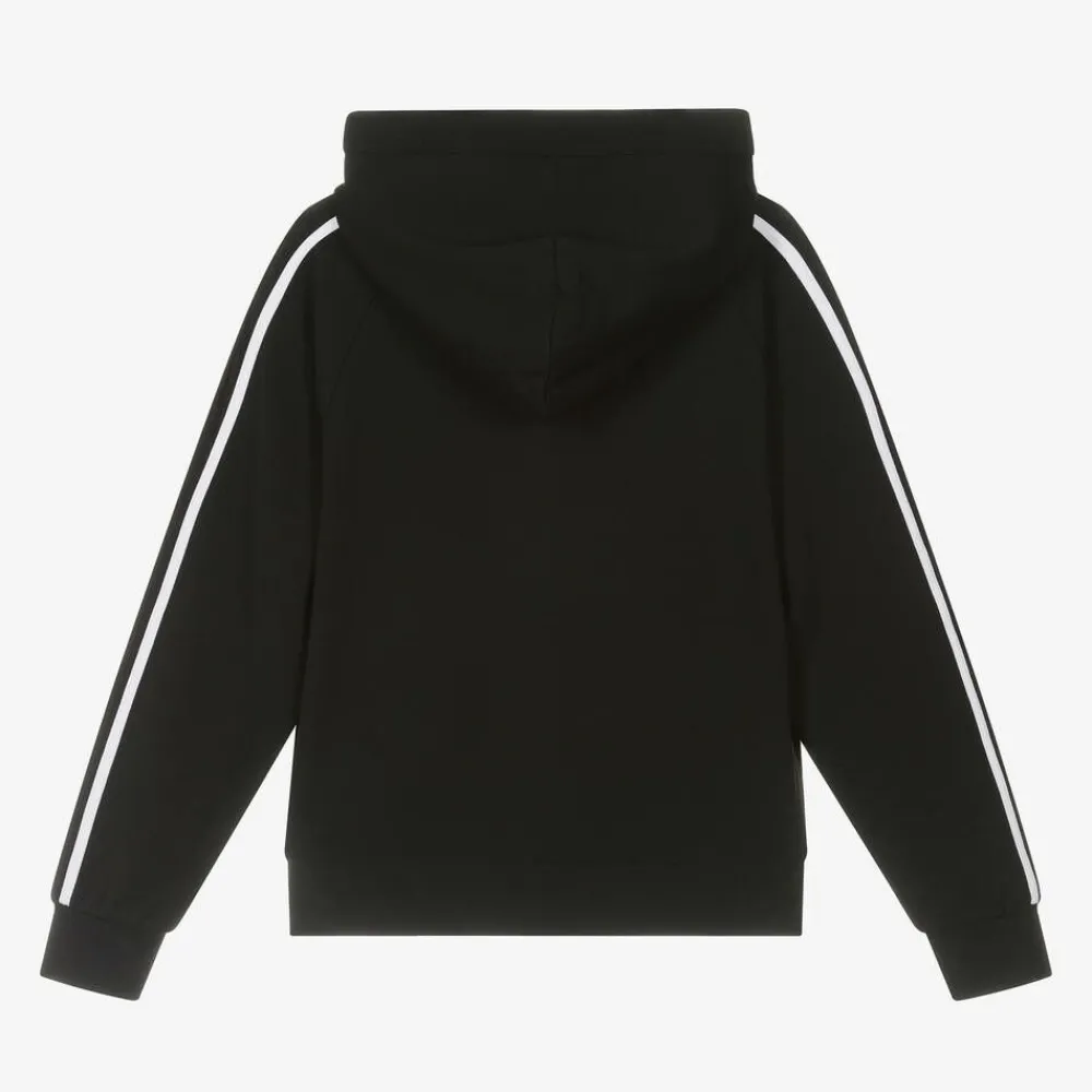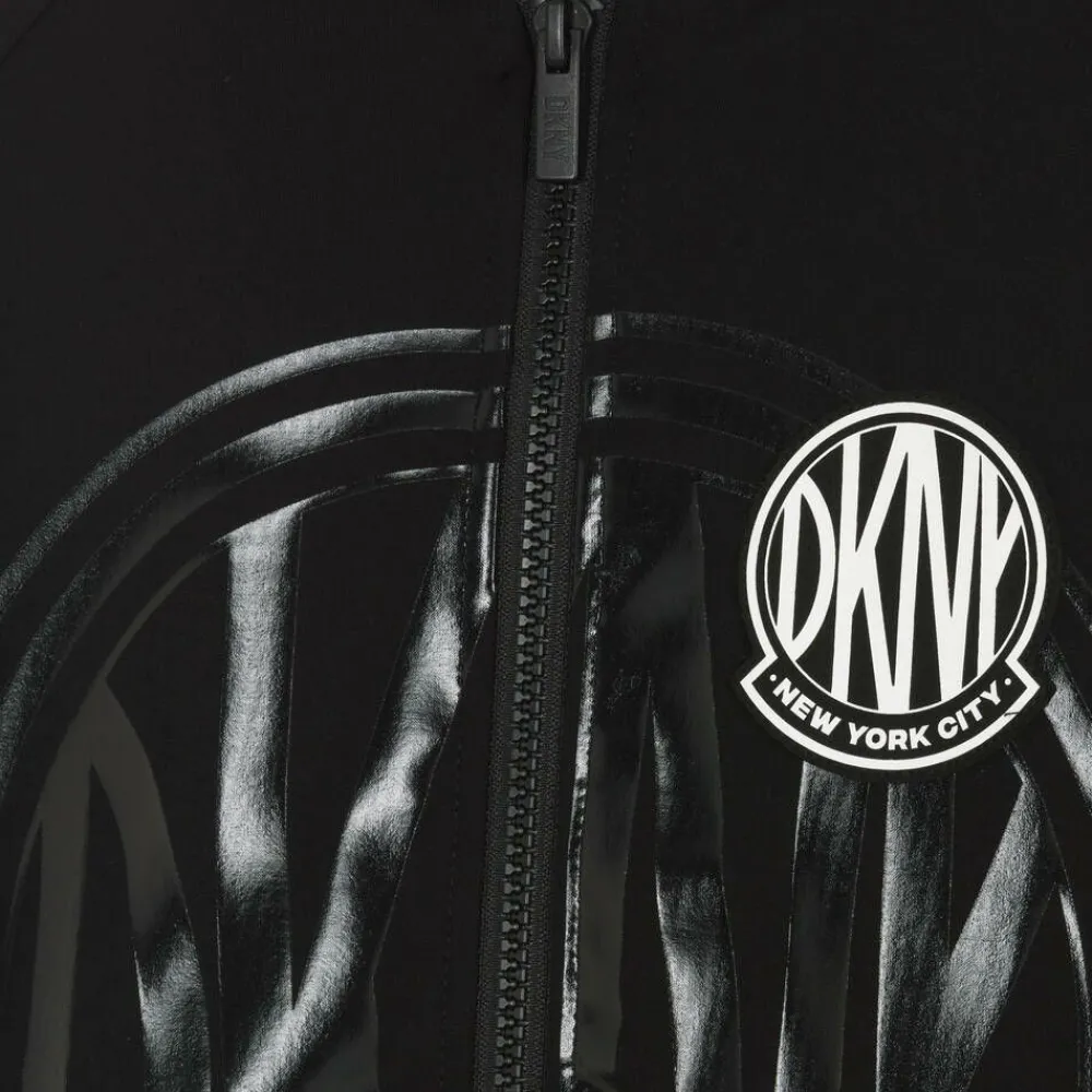 In DKNY's signature black with white trim, this hooded zip-up top is designed for both boys and girls. Made in luxurious Milano jersey, it has a tonal, shiny logo print on the front with a smaller, matching rubberised motif on the chest in white. There are useful side seam pockets and the front zip fastening has a branded pull tab to complete the look.
