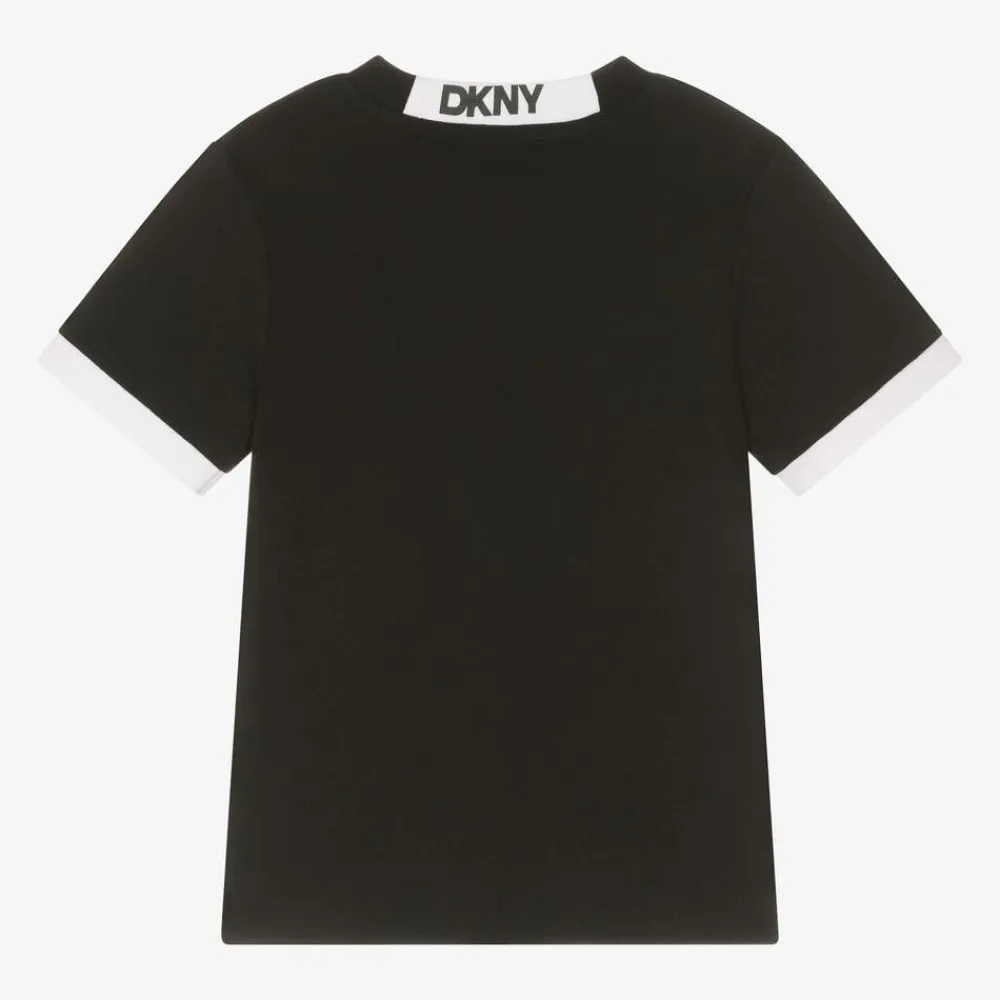 Black T-shirt for boys and girls by DKNY, made in soft and stretchy organic cotton jersey. Cool and comfortable, the short sleeves have white ribbed cuffs and there is a black and white embroidered appliqué logo patch on the front. For added designer appeal, it has a white and black logo printed on the back of the neck.