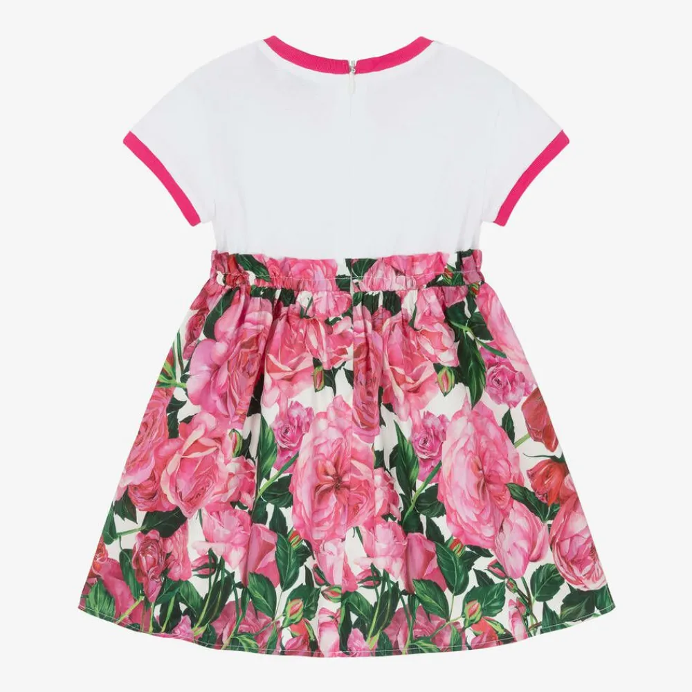 Gorgeous pink and white floral cotton dress for baby girls by luxury Italian designer Dolce & Gabbana. The comfortable white jersey bodice has pink, ribbed trims and a glittery, floral DG logo printed on the front, with the word 'Princess' sparkling below. The full, gathered, poplin skirt has a pretty, frilled waist and is patterned in beautiful rose blooms in pink and green, interspersed with black logos. It fastens with a neat, concealed zip on the back and comes with useful, matching, floral bloomers.