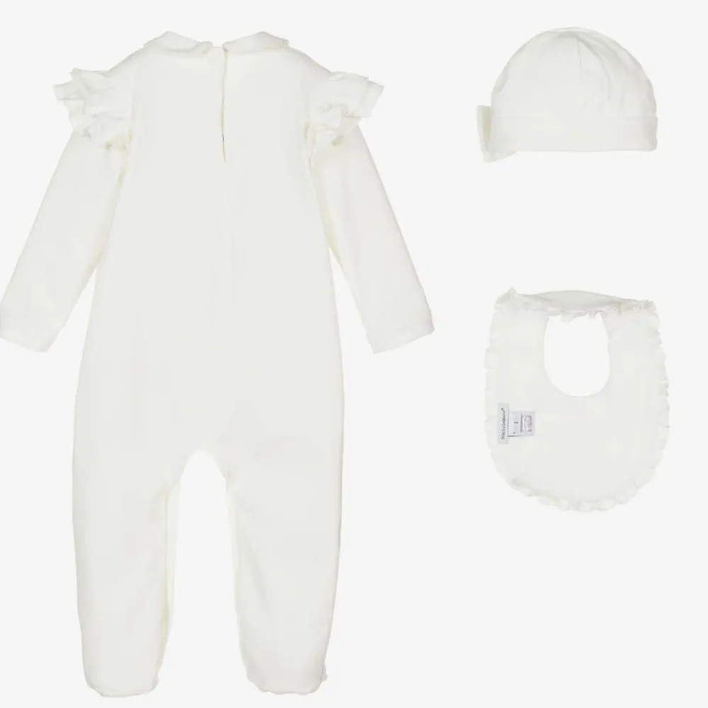 Baby girls off-white babygrow gift set by luxury Italian designer, Dolce & Gabbana. All piece are made in beautifully soft, brushed feel cotton jersey, with gold DG logo embroidered details. The babygrow has pretty ruffles over the shoulders, satin pipings and decorative buttons on the front. It fastens with concealed poppers on the back and between the legs. Presented in special, branded box, this lovely gift is completed by a coordinating hat with a bow and towelling-lined bib.
