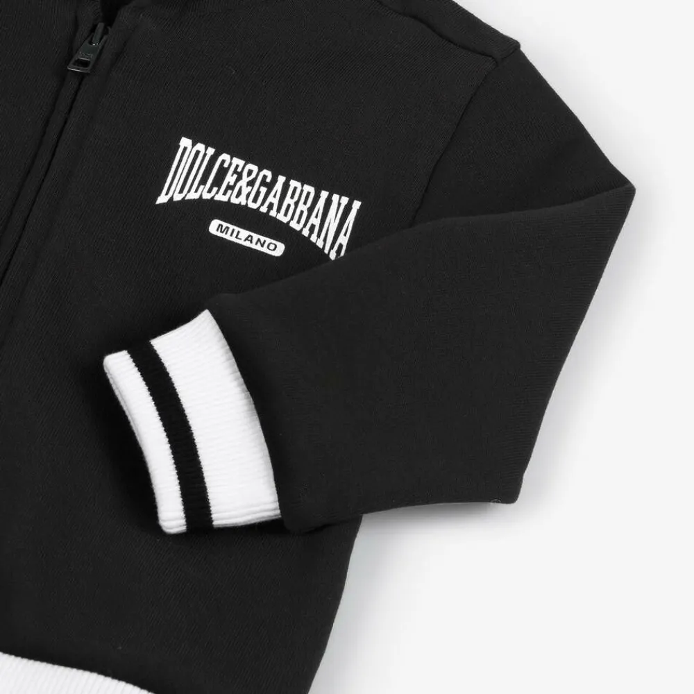 Black zip-up hoodie for younger boys by luxury Italian brand Dolce & Gabbana, made in soft and comfortable cotton jersey. Adding a cool, varsity-inspired look and instant designer appeal, the brand's logo is printed boldly in white on the chest. The stretchy ribbed trims are striped in white for a stylish, coordinating finish and it fastens neatly on the front with a branded zip.