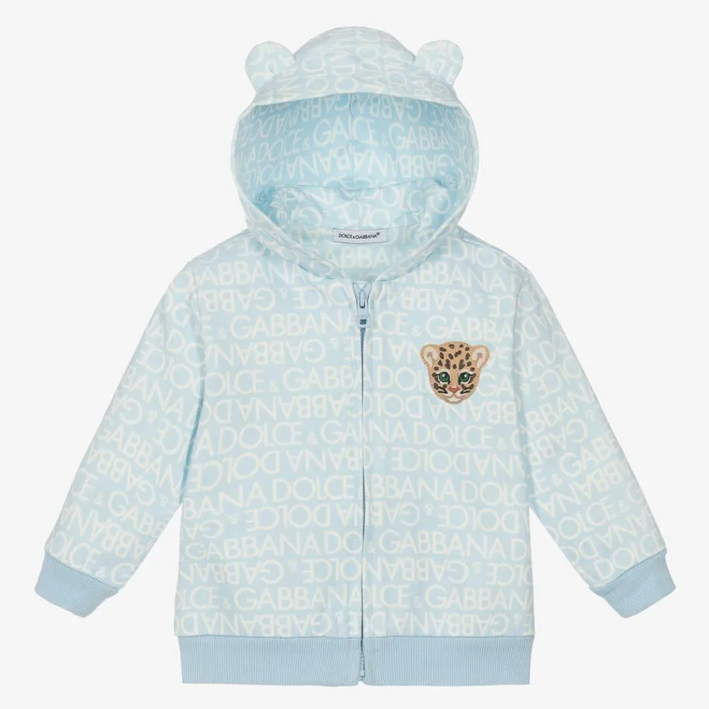Younger boys pale blue and white zip-up top by luxury designer Dolce & Gabbana, made in soft jersey. Patterned with a bold logo design, this cute top has a sweet leopard motif appliquéd on the chest and gently ribbed trims for comfort. Long-sleeved, it fastens with a branded zip on the front and has a large jersey-lined hood, cosy for little ones.