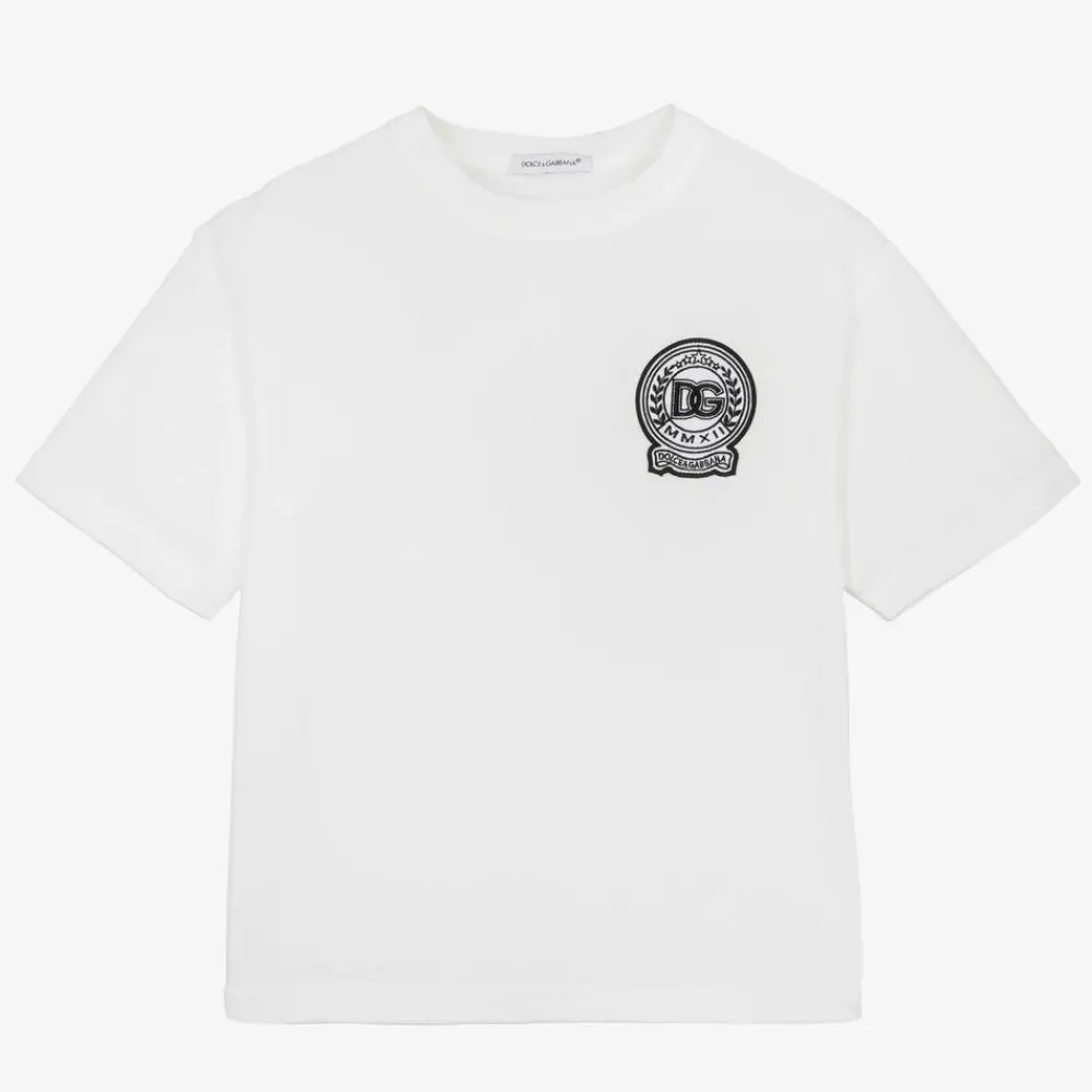 White short-sleeved T-shirt for boys by luxury Italian brand Dolce & Gabbana. For instant brand appeal, it has an embroidered DG logo patch on the chest in black and white. This casual tee has is made in comfortable cotton jersey, with a ribbed crew neckline.