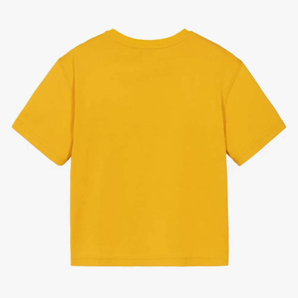 Mustard yellow T-shirt for boys by luxury Italian brand Dolce & Gabbana, made in soft cotton jersey. This casual tee has a classic ribbed crew neck and features a black racing themed DG logo on the front and a black and white logo patch by the hem.