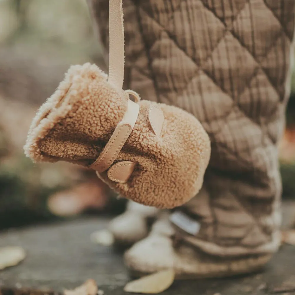 Super cute light brown mittens for baby boys and girls by Dutch brand Donsje. Handmade in soft teddy fleece with 3D leather ear details, they are lined in soft and cosy ivory faux fur. They have a leather velcro fastening strap to thread through sleeves and come in a branded pouch with an adorable tingling bell charm.