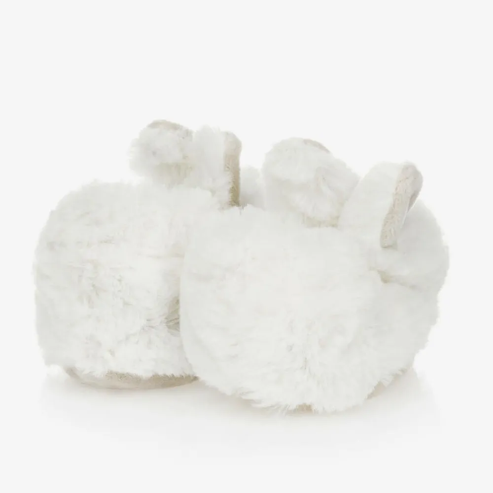 These gorgeous white slippers by Doudou et Compagnie are made for baby boys and girls. They have a gentle rattle sound, which will help keep baby amused as they move their little feet. They are made from super soft plush fur with a rabbit face and pale beige velour trims.