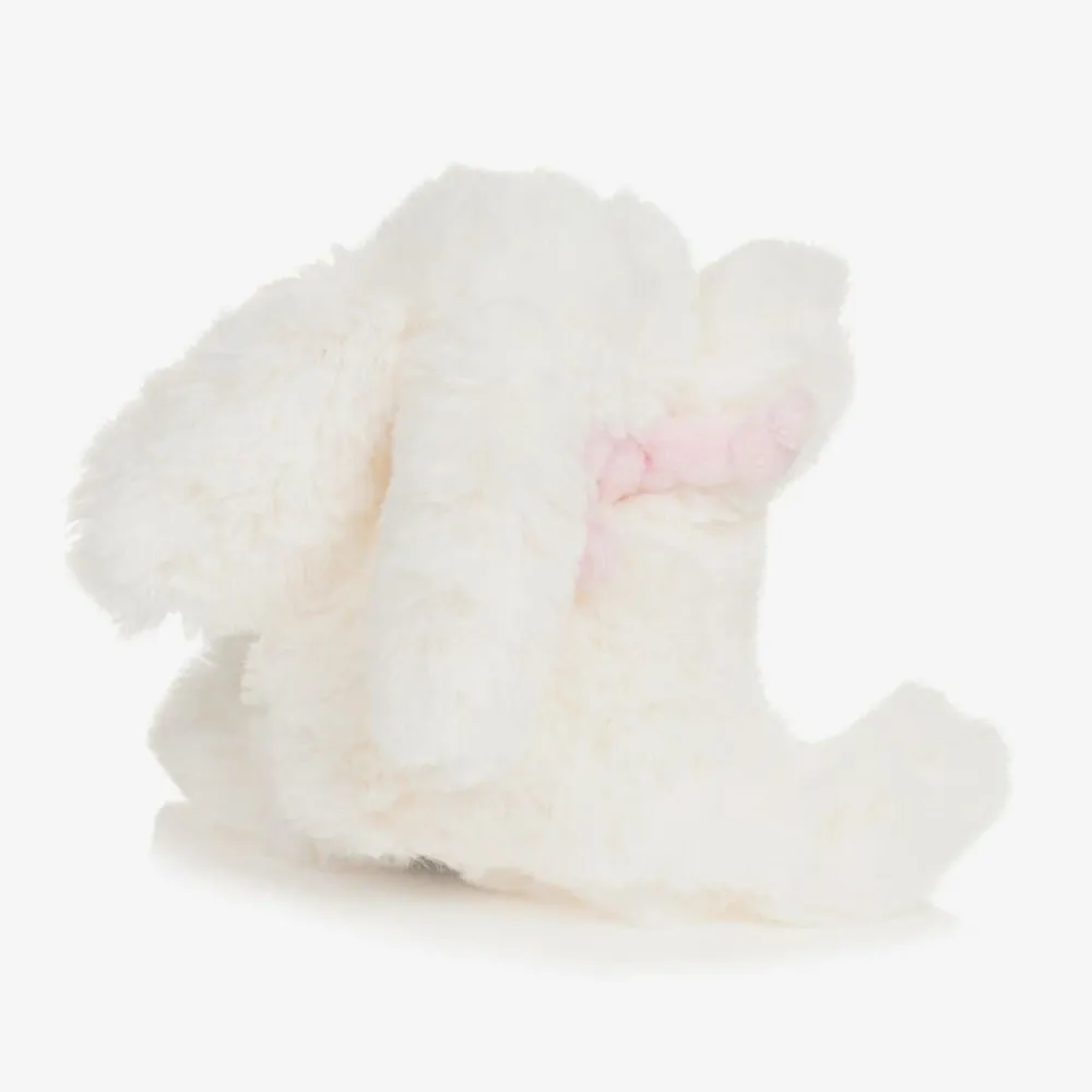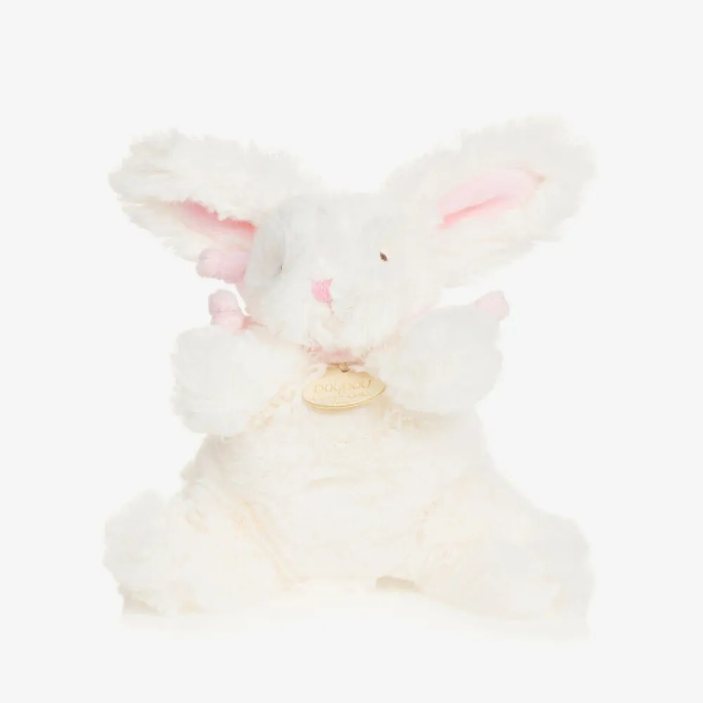 Ivory bunny toy for baby girls by Doudou et Compagnie. Made in soft plush, it has a sweet embroidered face and little pink ears. Just below rabbit's head is a pink knotted velour trim for little hands to grasp. Presented in a pink box, it would make a lovely gift for new parents.