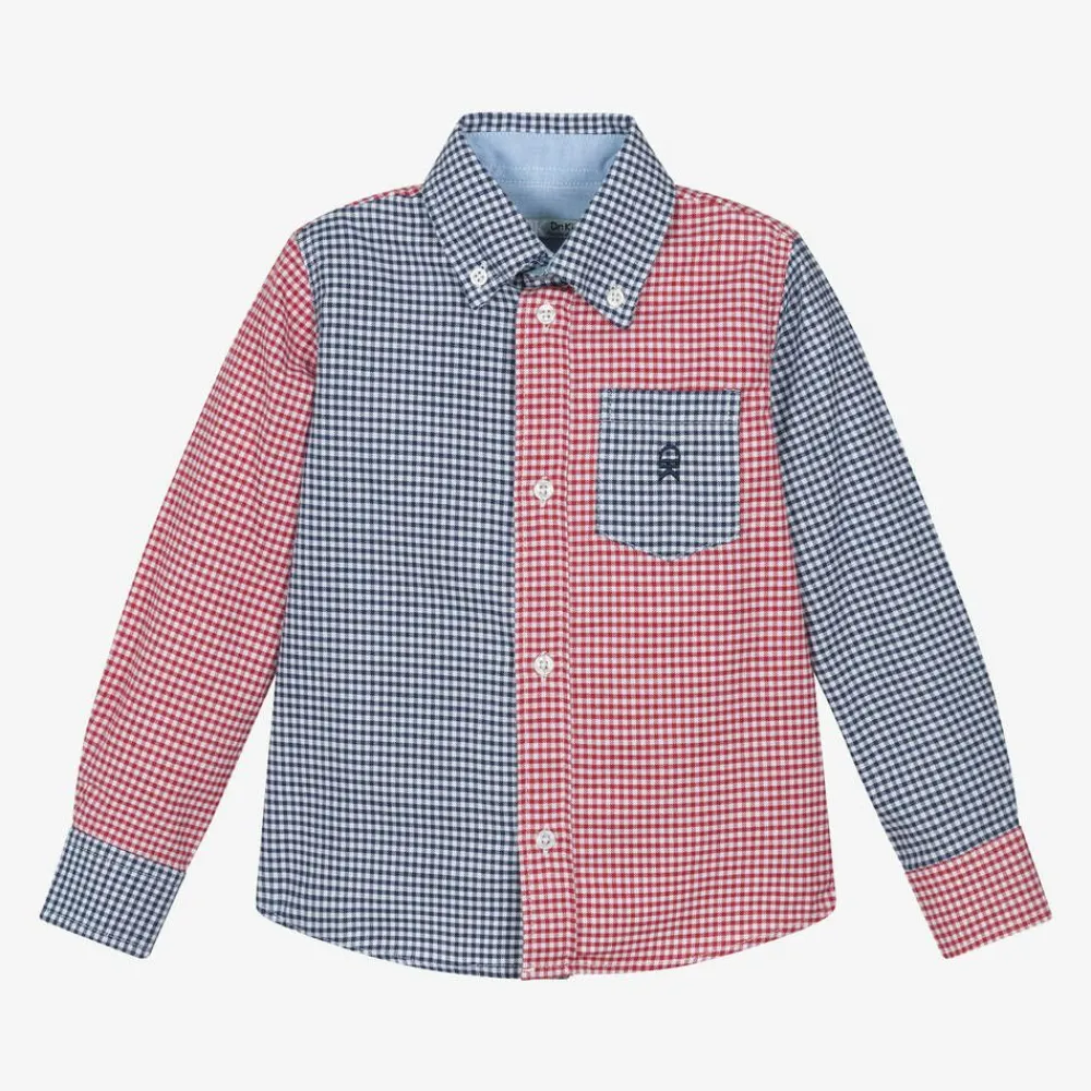 Smart-casual shirt for boys by Dr. Kid, in a navy blue and red check. It is woven in lightly brushed cotton twill. There are pearlescent button fastenings, with a navy blue monogram logo embroidered on the chest pocket.