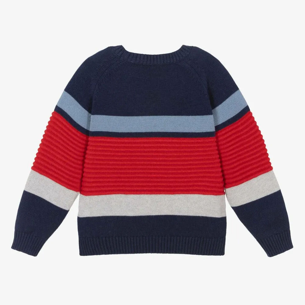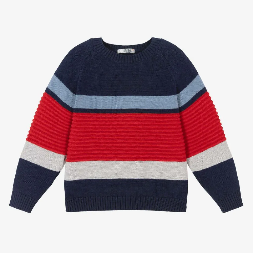 Striped in shades of blue, grey and red, this lovely crew neck jumper for boys is from Dr. Kid. It is softly knitted in a cotton and wool blend, with a textured rib panel around the middle and gently ribbed trims.
