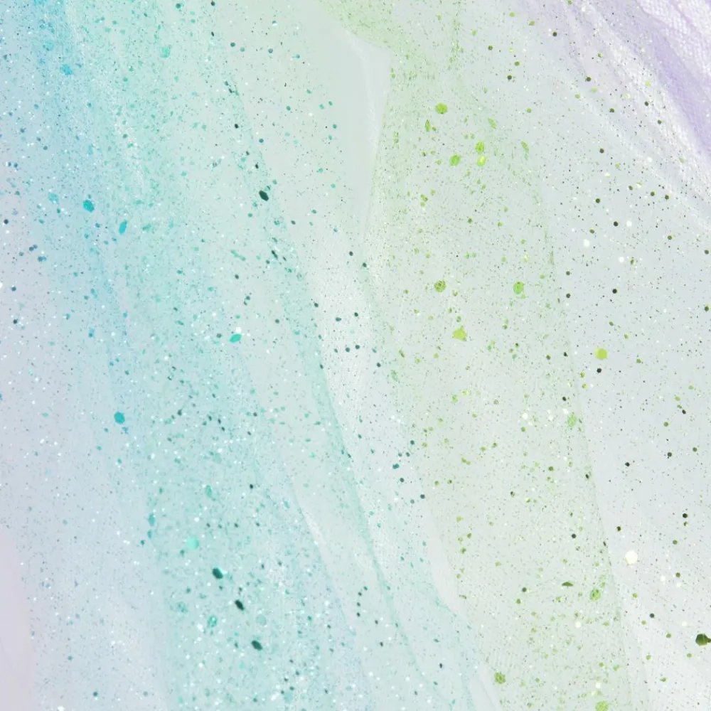 A magical glittery unicorn costume for girls from Dress Up by Design, in shades of purple, green, and white. Made from layers of lightweight tulle, the skirt has silky satin lining and a partially elasticated waistband for extra comfort. The coordinating headband has a padded silver horn, purple felt ears, pretty flower trims and a pastel rainbow tulle veil.