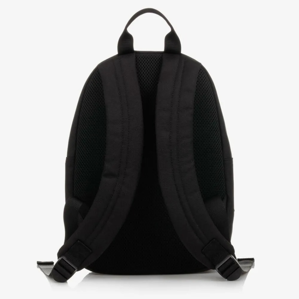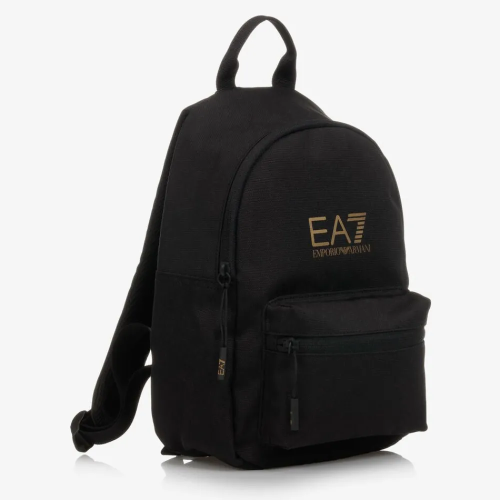 Black canvas backpack for boys and girls by EA7 Emporio Armani, made using eco-conscious recycled materials. It has two zip compartments with a velcro fastening slip pocket on the inside, helping to organise your child's belongings. There is a lightly padded mesh backing, ideal for safely storing a tablet or small laptop. Practical and lightweight, it is made in sturdy nylon canvas with a carry handle, along with adjustable shoulder straps for a great fit.