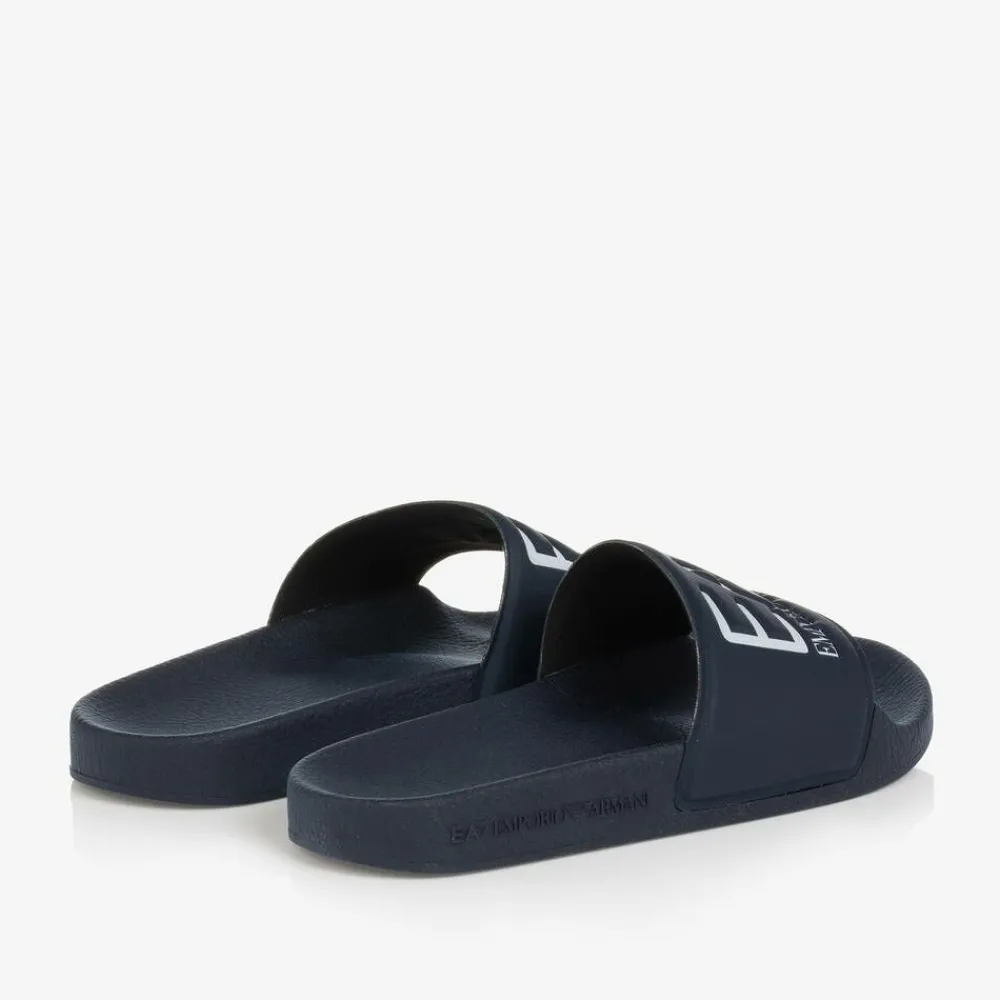 Navy blue sliders for boys and girls from EA7 Emporio Armani, cool for the pool, on the beach or to compliment everyday casual outfits. These easy slip-ons are made from soft rubber with a moulded footbed for comfort. They have a bold white logo embossed across the strap for instant recognition and an additional branding moulded on the sole.
