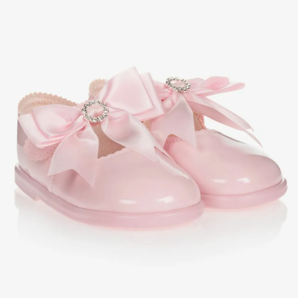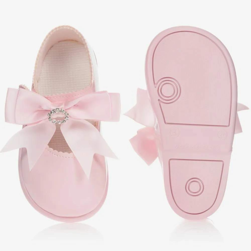 Pink first walker shoes for little girls by Early Days Baypods, made in soft patent faux leather. They have a soft flexible sole and a comfortable lightly padded insole, with large ribbon bows and diamanté trims.