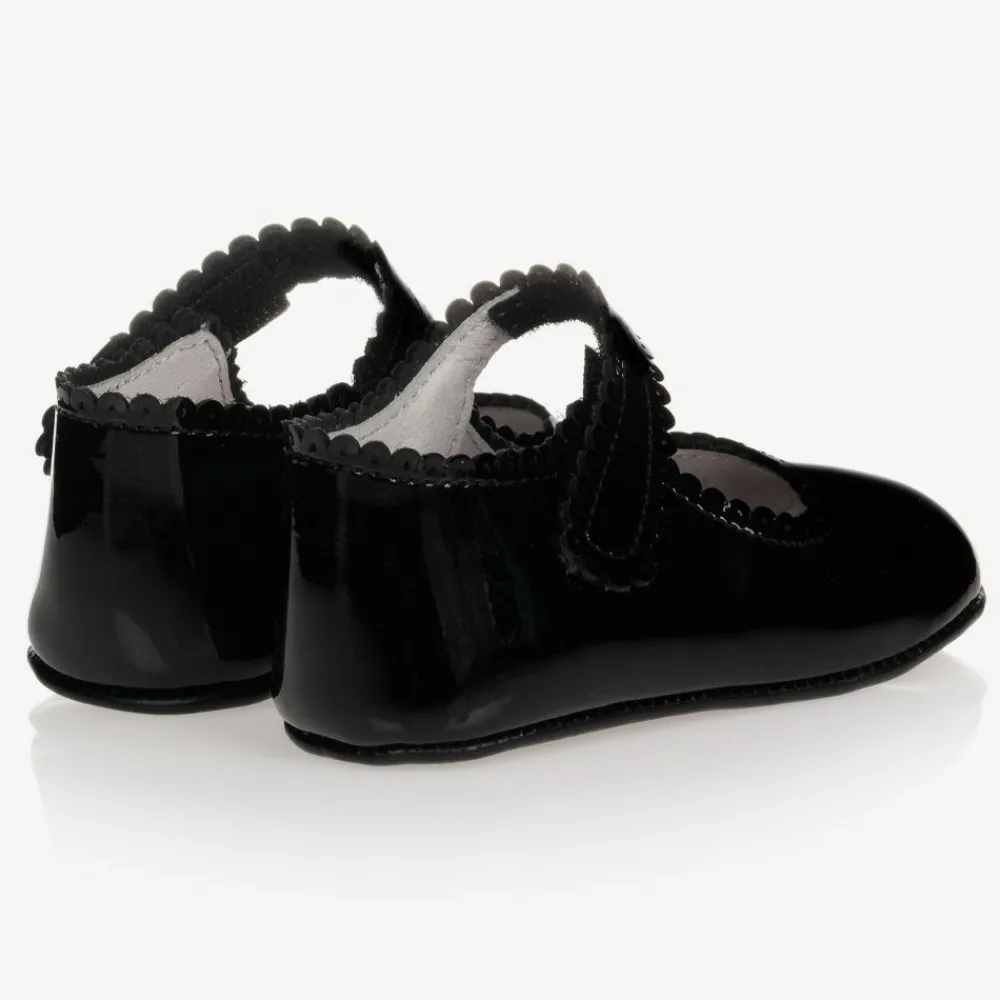 Patent black baby shoes by Early Days, made in flexible and lightweight leather with adorable scalloped edges.