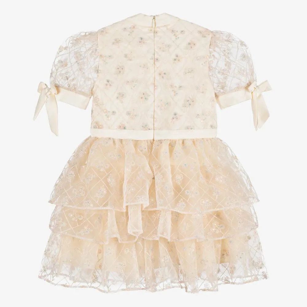 Shimmering dress for girls by EIRENE, designed with special occasions in mind. Made in sumptuous ivory satin with a pink tulle overlay, it is embroidered with a pink, blue and ivory diamond pattern, embellished in sequinned flowers that catch the light beautifully. It has a stand-up satin collar with a fixed bow below, matching the bows on the cuffs of the sheer, puffed sleeves. The tulle tiers on the skirt have layers of tulle below for extra volume and swish. Fully lined in voile for comfort, there is a concealed zip fastening on the back.