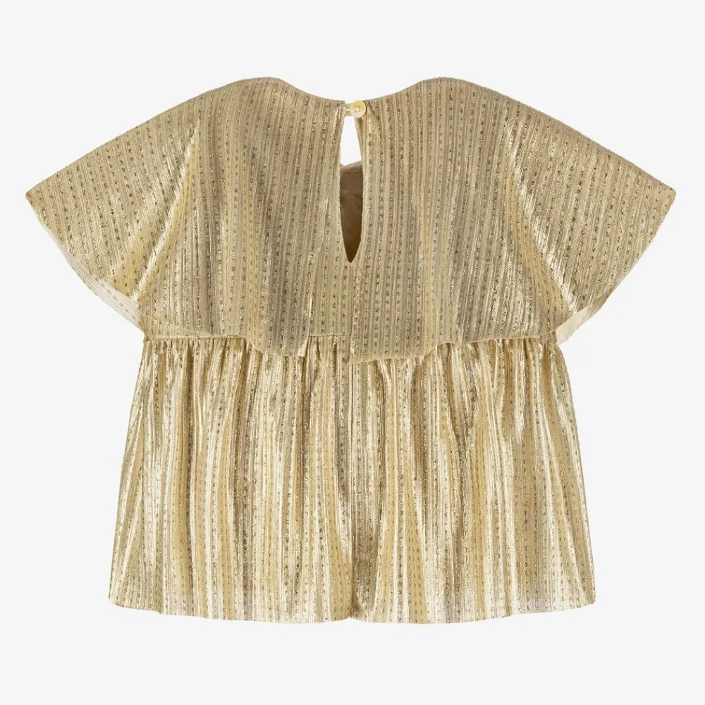 Pretty sparkly gold blouse for girls by EIRENE, made in soft and stretchy plissé fabric. Lined in soft cotton, the short sleeves are created by a floaty cape effect over the shoulders. There is a contrast gold bow on the front and a keyhole button fastening on the back.