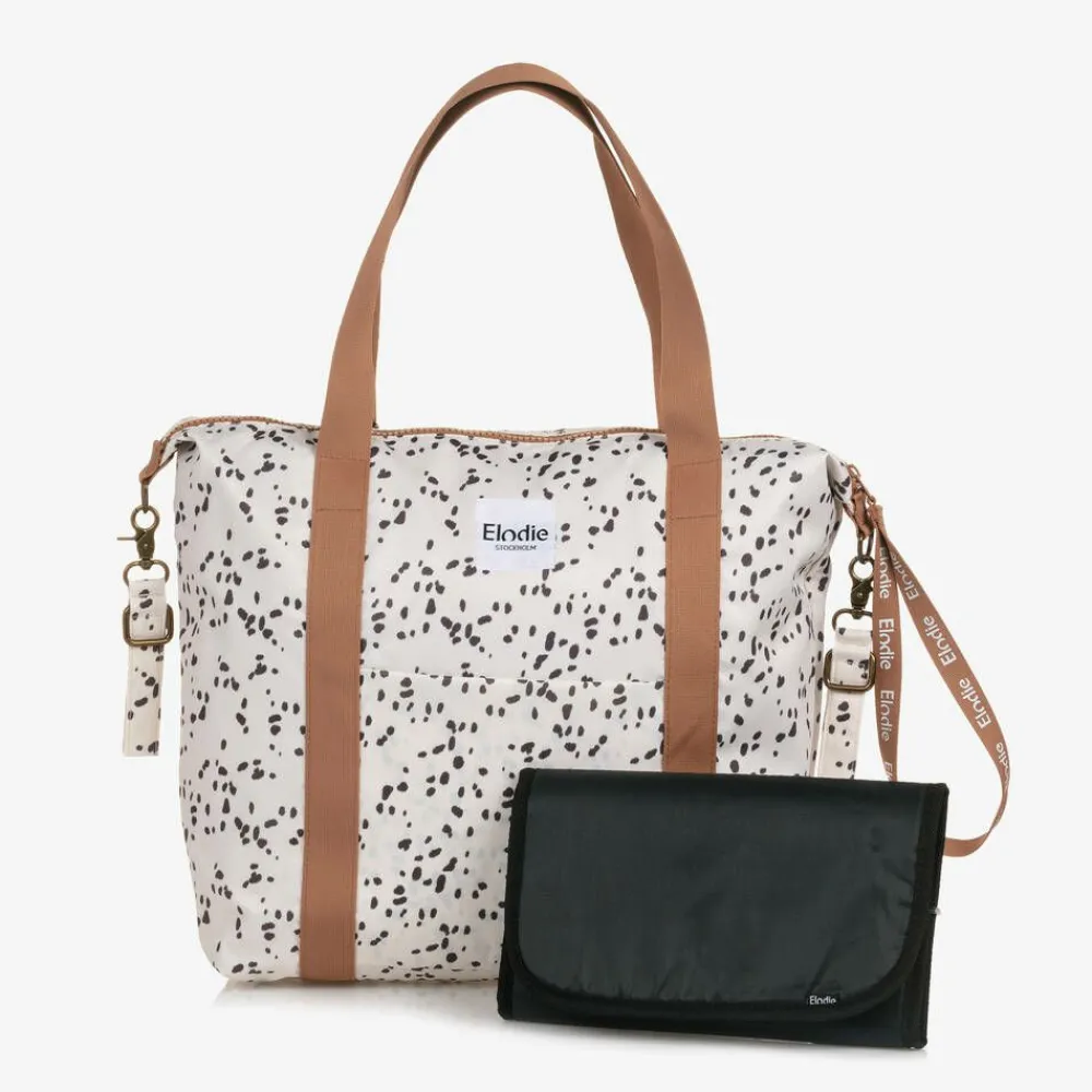Lovely ivory dalmatian print changing bag by Scandi brand Elodie, with a wipe-clean changing mat included. The spacious main zip compartment has organisational pockets and an attached, insulating bottle holder. It has durable carry handles and clip-on stroller straps, adding versatile carry options. A monochrome logo badge stitched on the front completes the style.