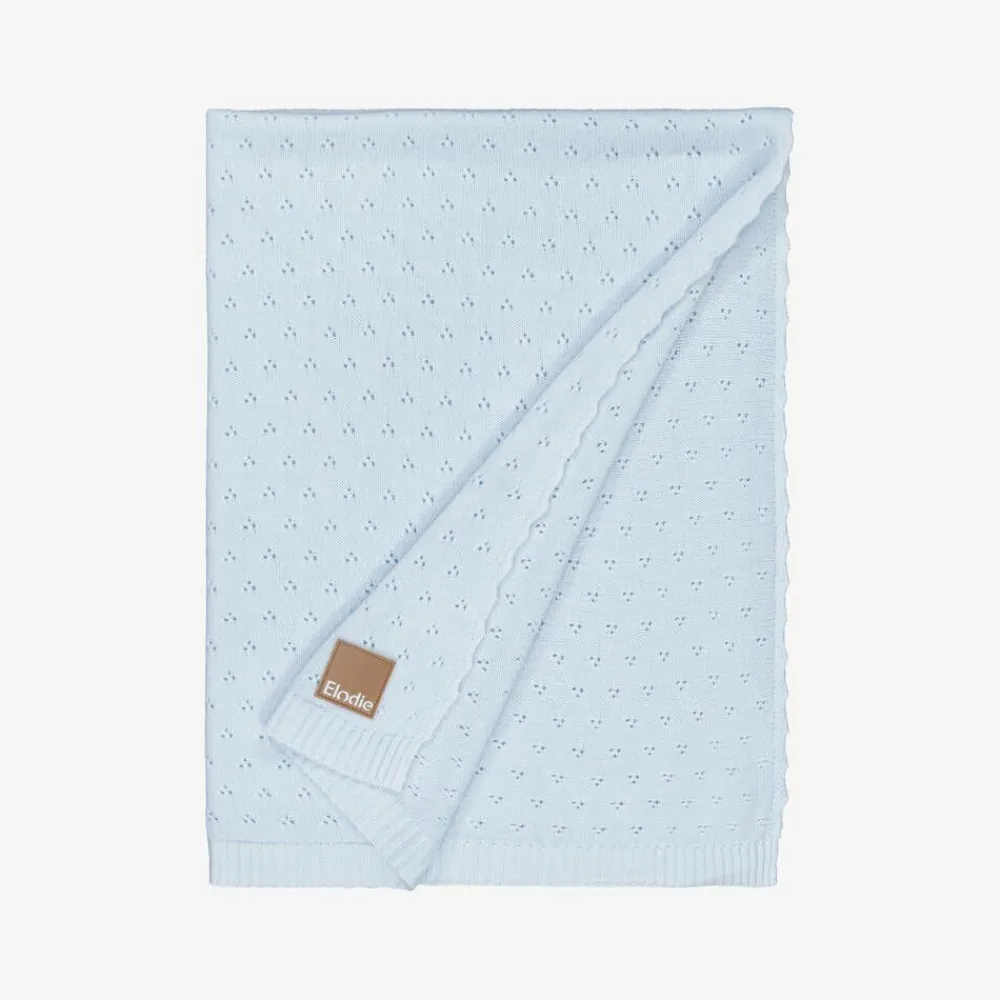 Lovely pale blue blanket for baby boys and girls by Swedish brand Elodie, with a lacy, pointelle knit. Super soft and comfortable, it is ideal for the nursery, for use in the stroller or car seat or for presenting baby. There is a brown, faux leather logo badge in one corner.