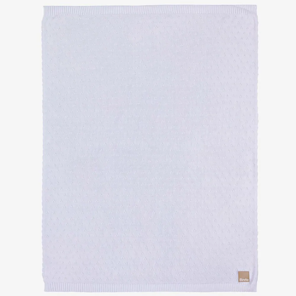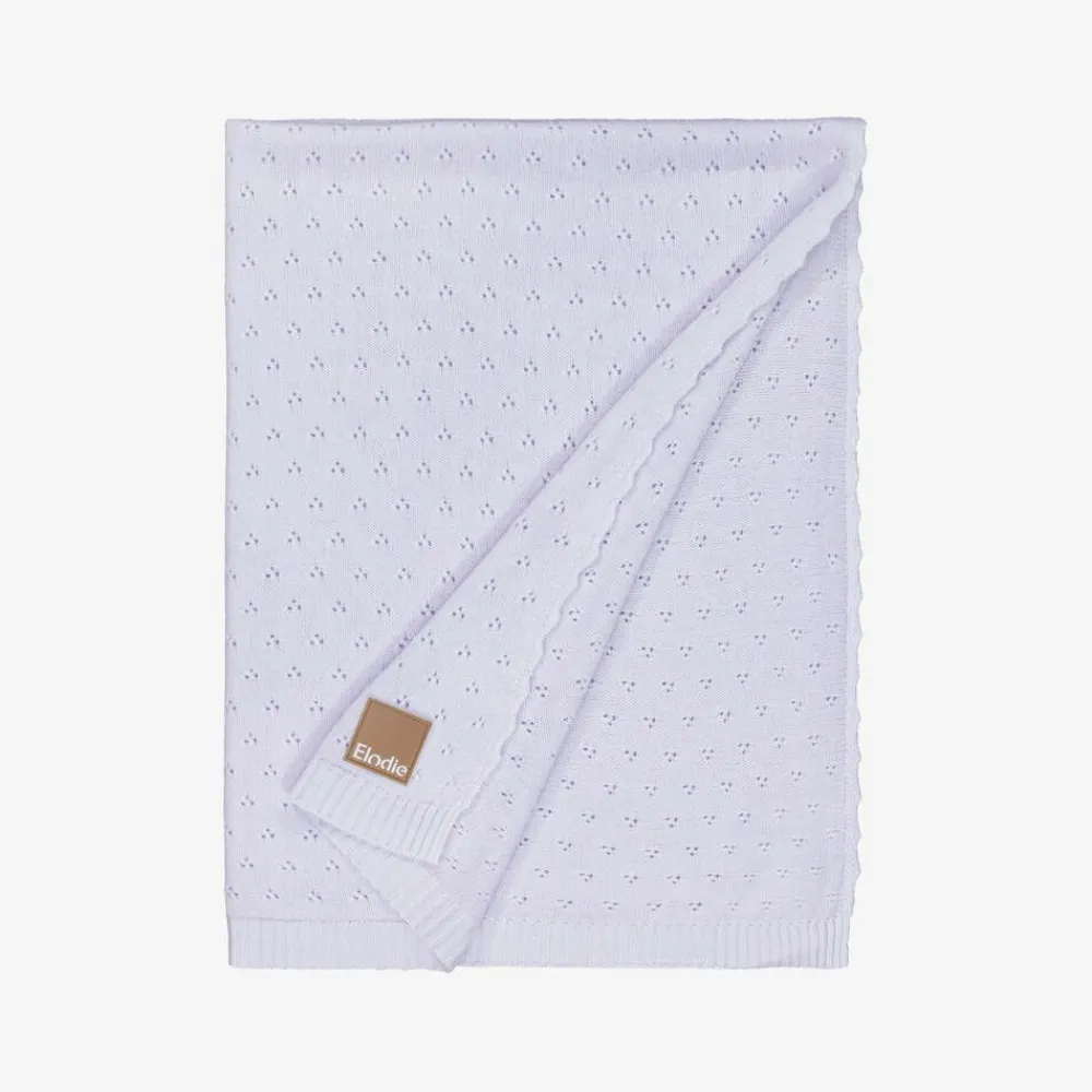 Lovely pale blue blanket for baby girls by Swedish brand Elodie, with a lacy, pointelle knit. Super soft and comfortable, it is ideal for the nursery, for use in the stroller or car seat or for presenting baby. There is a brown, faux leather logo badge in one corner.