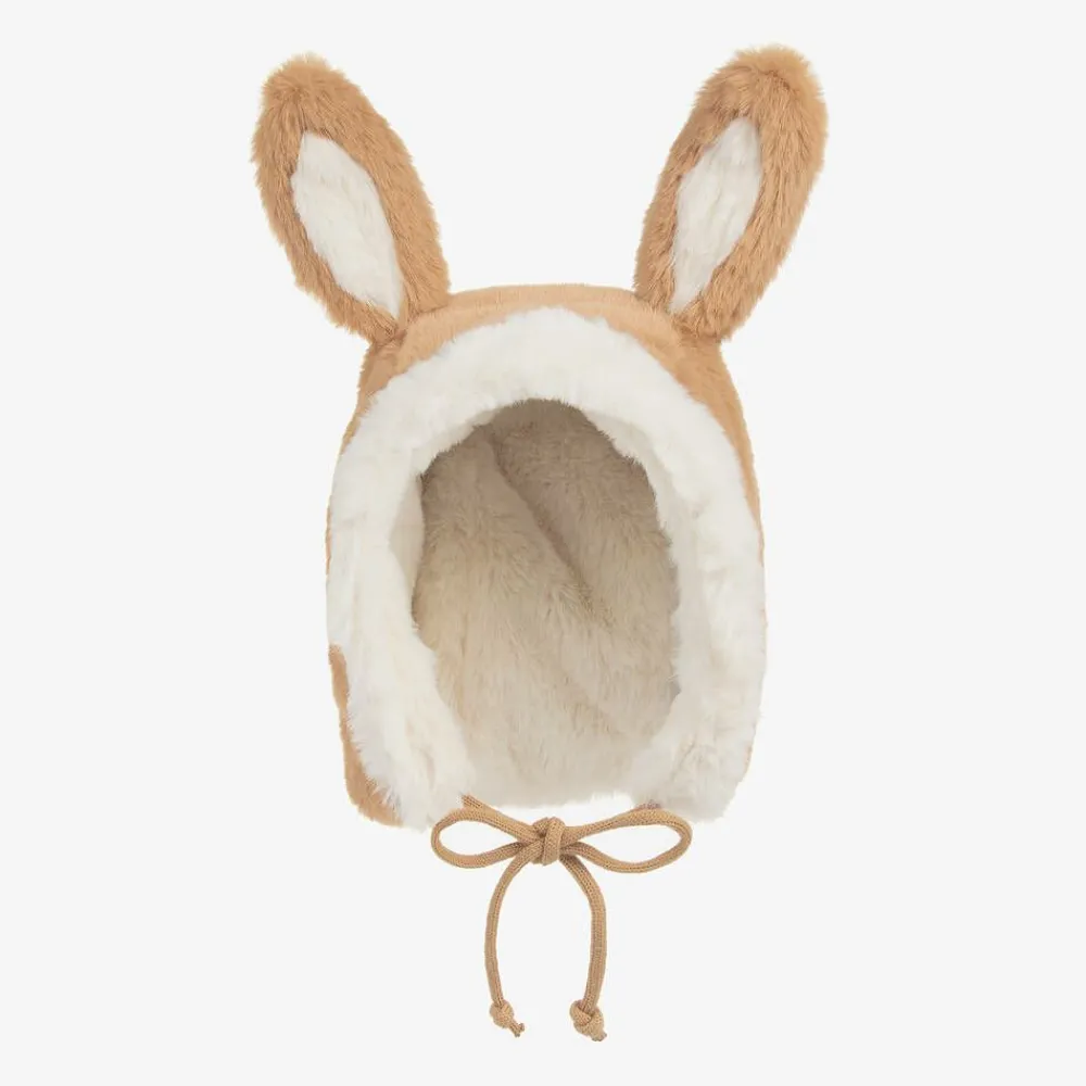 An adorable tan brown and ivory hat for baby boys and girls by Elodie, made in beautifully soft plush fabric. Styled like a bonnet, this cute design has floppy bunny ears on the top and tie fastenings under the chin to help it stay on baby's head. The rounded shape covers the head and ears to keep them warm and cosy on chilly days.