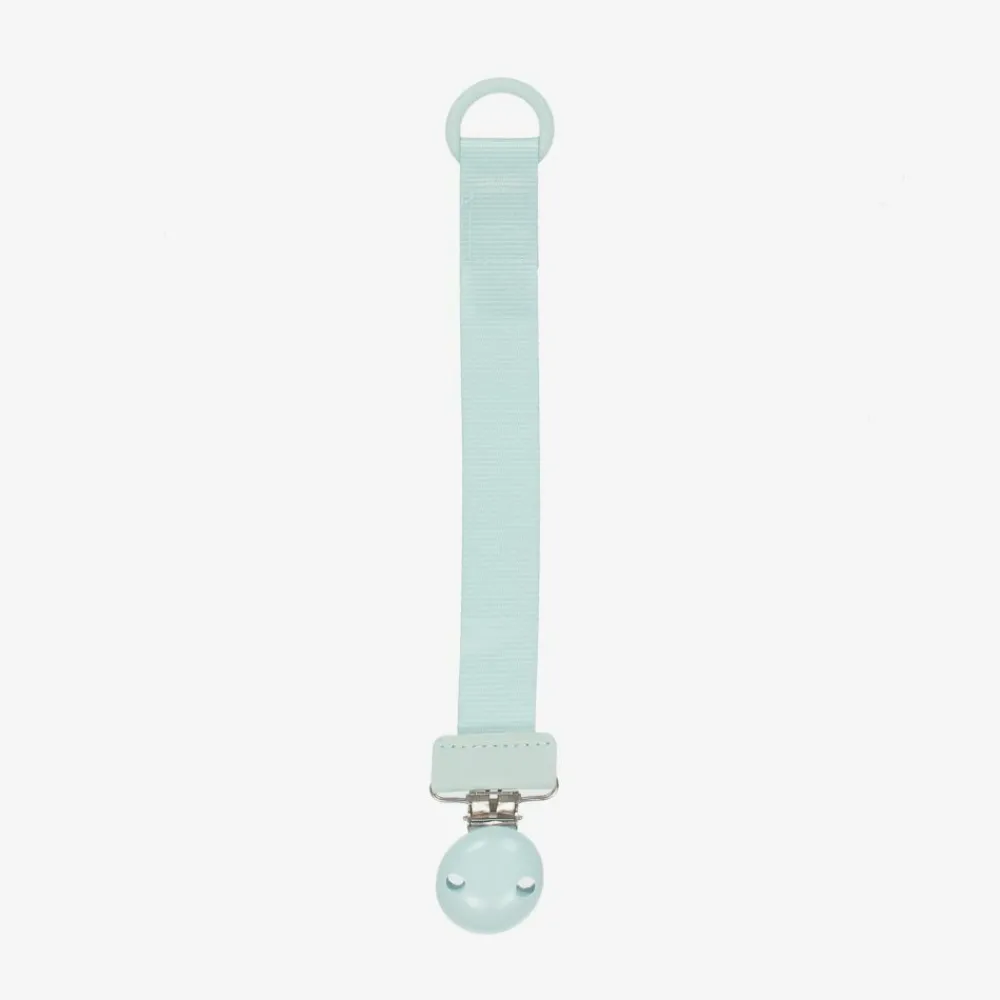 Turquoise blue dummy clip for baby boys and girls by Swedish brand Elodie. Made from recycled grosgrain ribbon, the strap has a durable silicone ring to attach to your little one's dummy. The metal buckle has a lacquered wood covering and attaches onto their clothing to prevent it from getting lost.