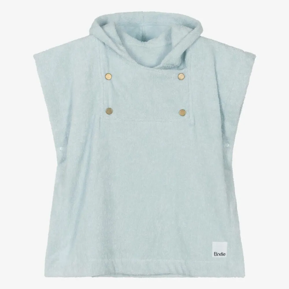 Pale blue hooded poncho towel for little boys and girls by Swedish brand Elodie, made in soft, absorbent cotton terry for super quick drying after a bath or a swim. Mid-weight, it has decorative, brass-coloured buttons on the front and popper fastenings on the sides, which allow movement yet keeps the poncho in place.
