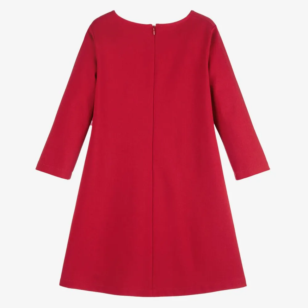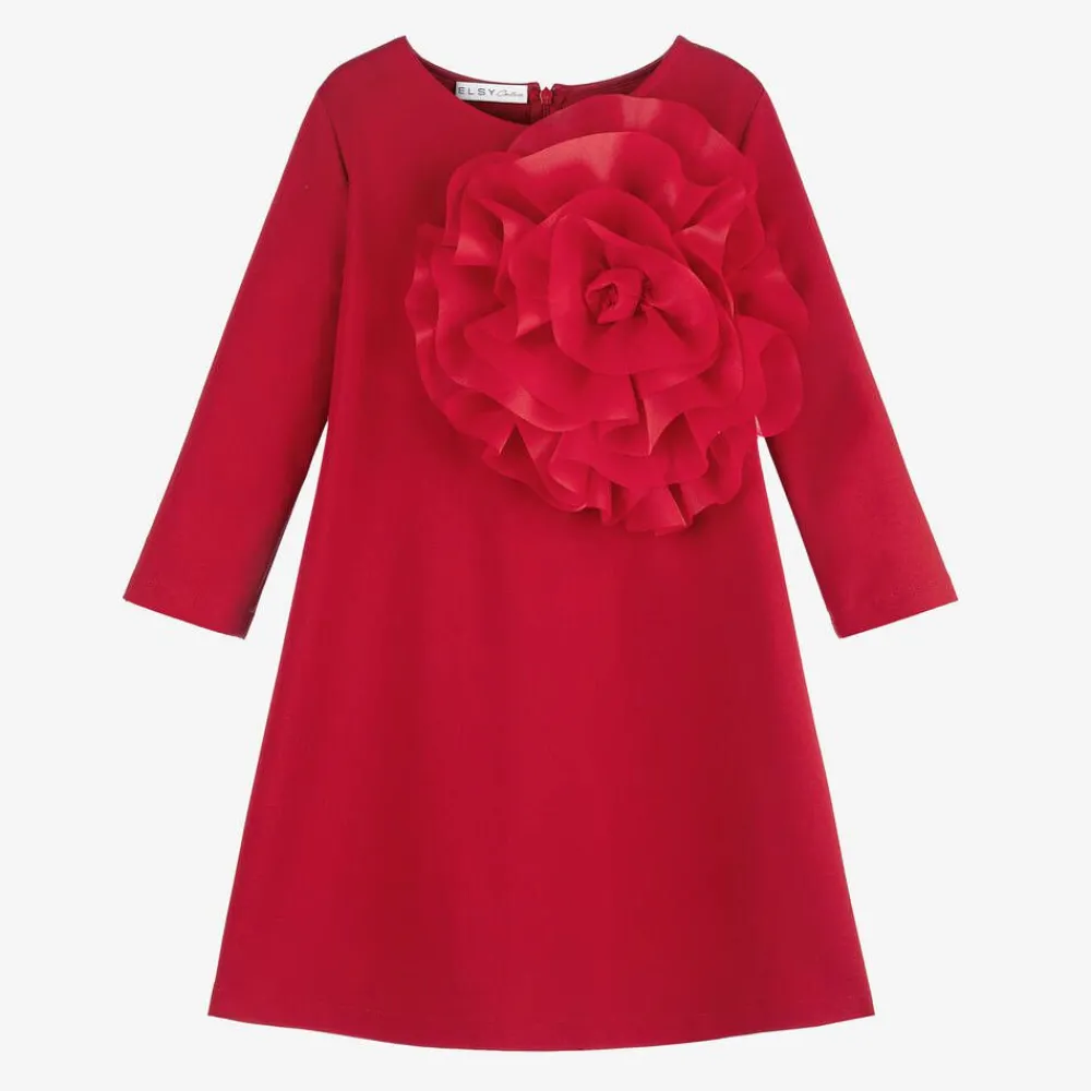 Effortlessly stylish, red Milano jersey dress for girls by Italian label Elsy. This simple A-line silhouette, with a statement organza flower appliqué on the front, is lovely for parties and special occasions. A neat zip fastens at the back for a seamless finish.