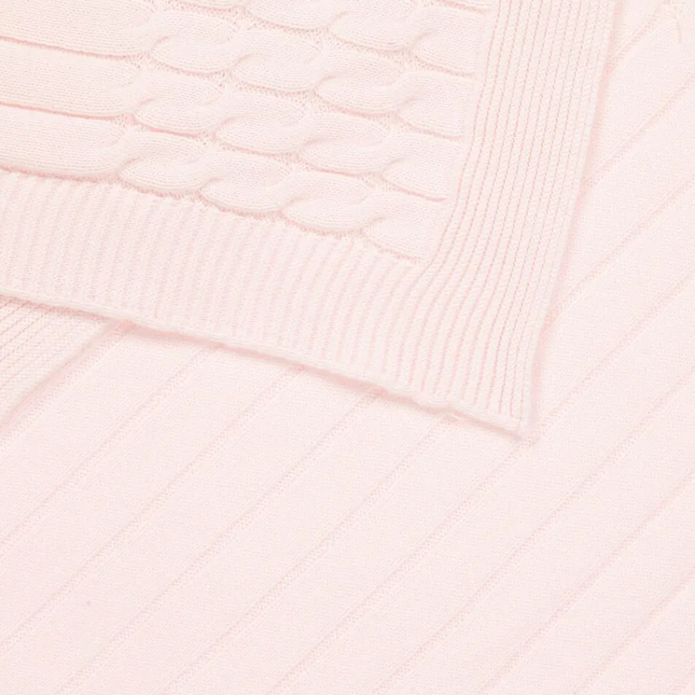 A sweet pale pink blanket for baby girls by Emile et Rose. Beautifully knitted in super soft cotton, it has a striped and cable knit design with a ribbed border. Lovely and lightweight, it can also be used in the stroller or as a nursery accessory.