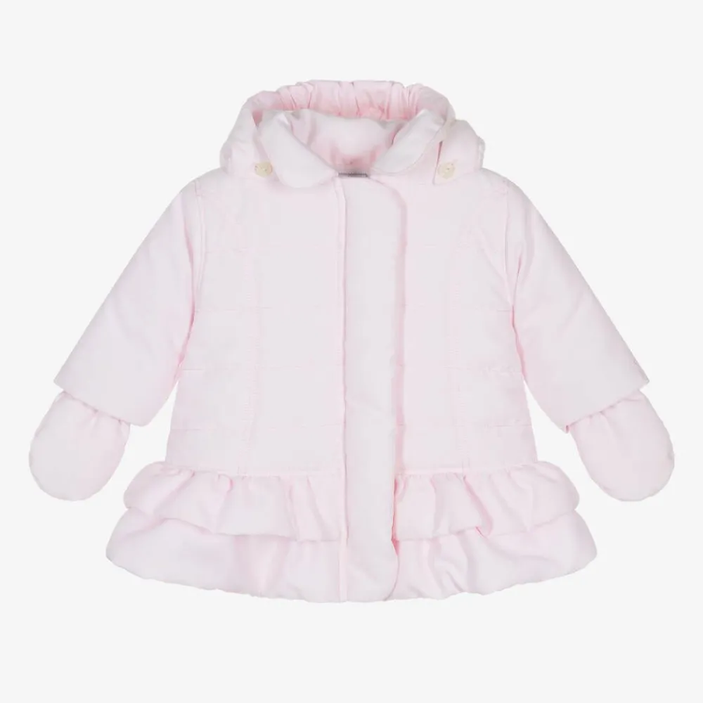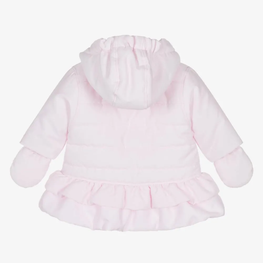 Pale pink coat for baby girls by Emile et Rose, with a comfortable jersey lining. Warmly padded, this cosy coat has a detachable hood and removable mittens which are both secured with buttons. It has a pretty frilled hem and a full zip fastening on the front. This is neatly concealed beneath a popper-fastened placket.