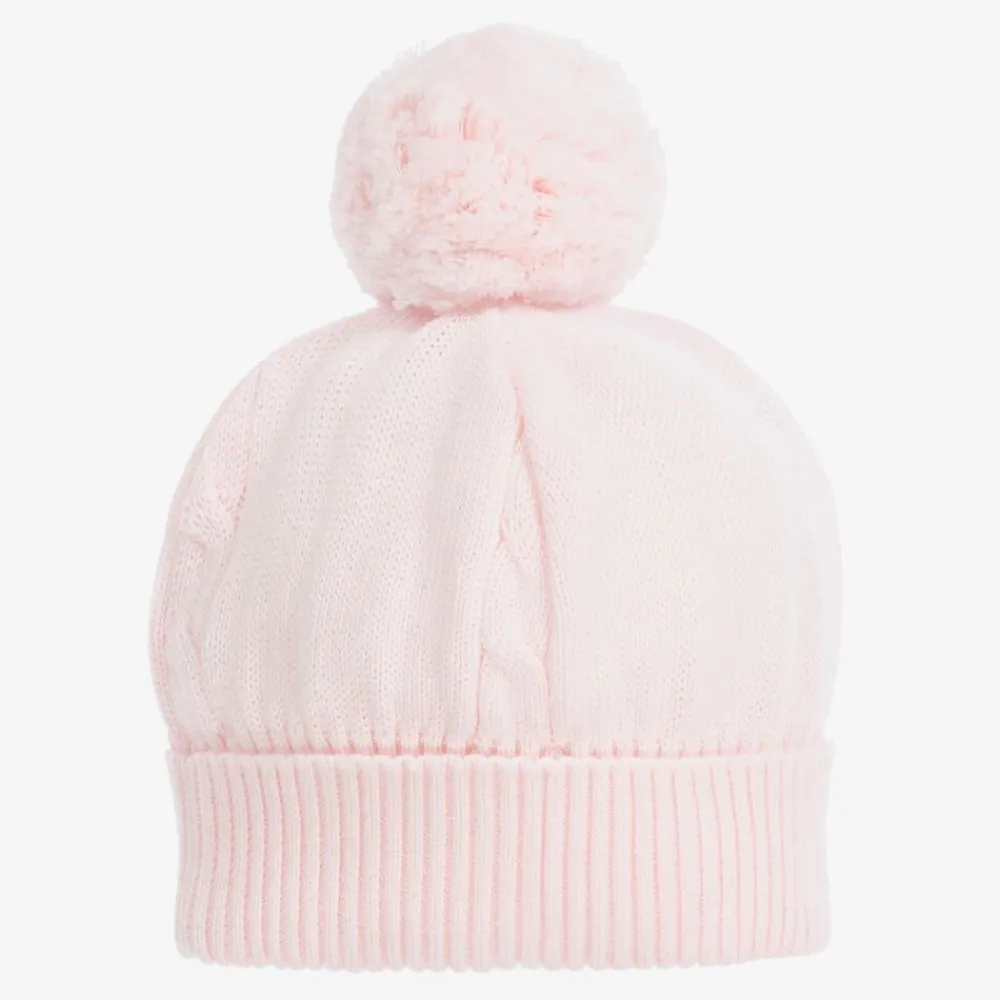 Cosy pale pink hat for baby girls, by Emile et Rose. Beautifully knitted in super soft cotton, it has lovely cable knit details, a pom-pom on the top, and a ribbed turned-up brim.