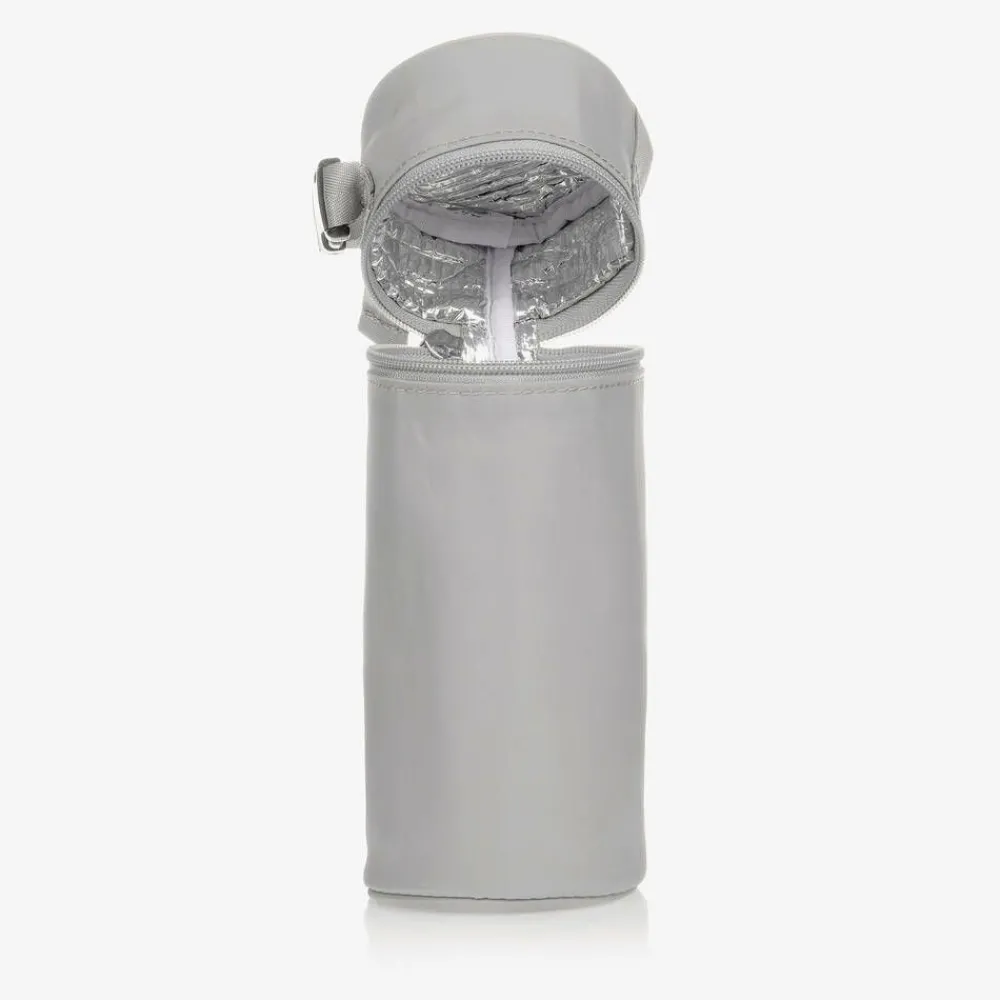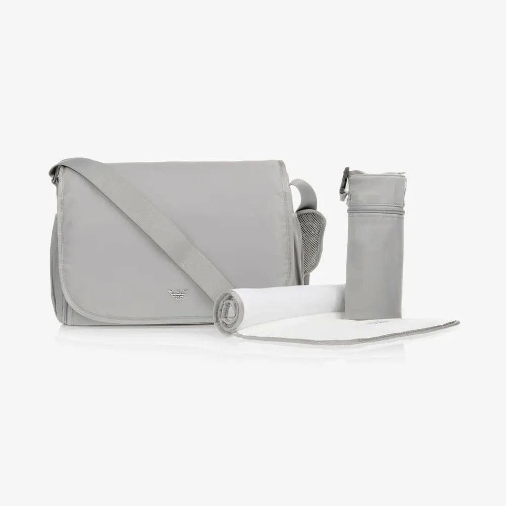 Practical and smart silver grey Emporio Armani changing bag, with a silver-tone Eagle logo plate. Smooth with branded trims, the main compartment has multiple pockets for easy organisation and magnetic popper closure on the flap. It has an adjustable shoulder strap and fixed stroller straps which can be neatly tucked away when not in use. It comes with a foldable changing mat and an insulated bottle bag.