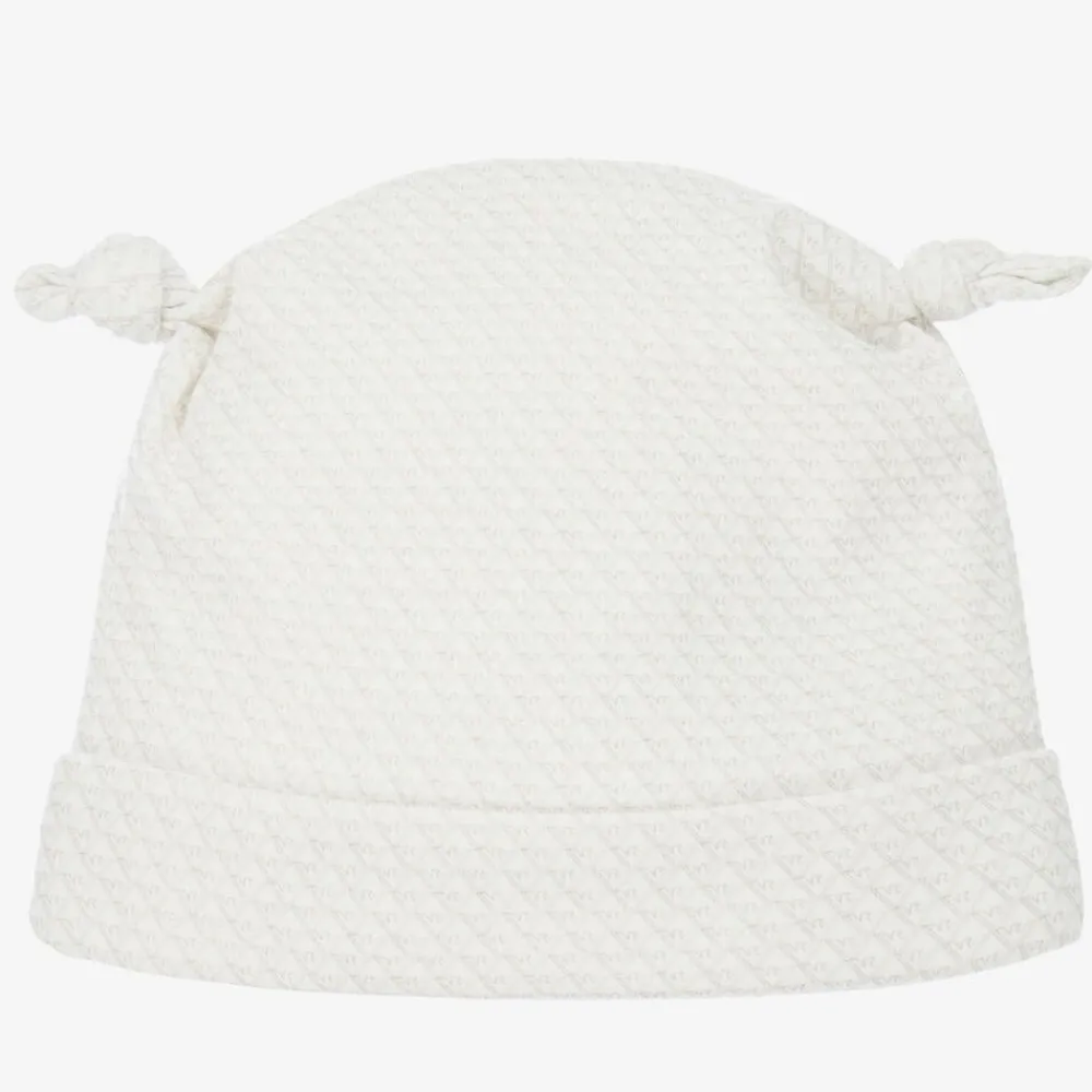 Ivory layette hat for baby boys and girls by Emporio Armani. Patterned in tiny beige Eagle logo print, it has cute knotted details on the top and a turned-up brim. It is made in luxury soft cotton jersey in a double layer for comfort.