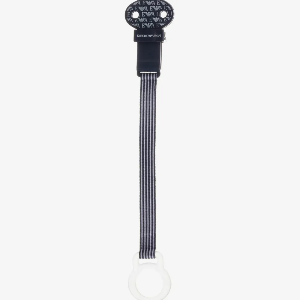 Baby boys navy blue dummy and clip set with the Eagle logo branding by Emporio Armani. The dummy has an anatomical silicone teat with a hard plastic holder and a clip with a striped fabric strap to fasten onto clothing.