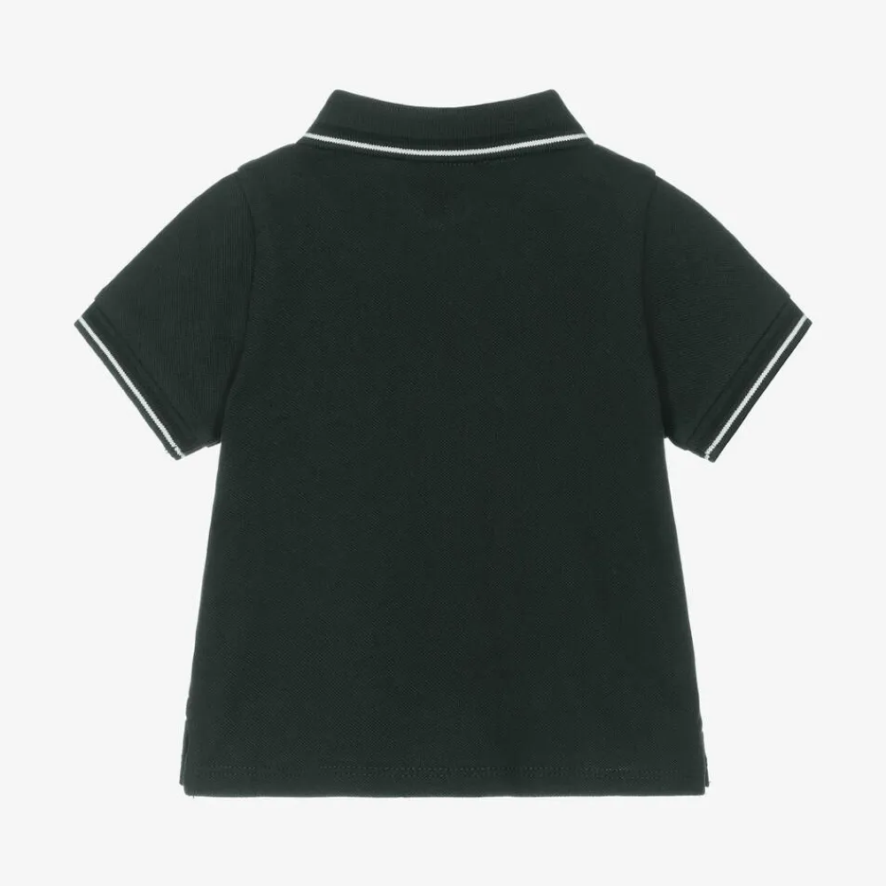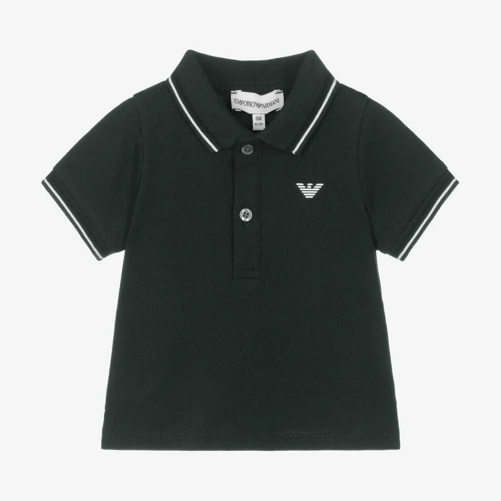 Baby boys dark green polo shirt by Emporio Armani, made in soft cotton piqué. This short-sleeved top has black and white stripes on the ribbed collar and cuffs. Instantly recognisable, the signature white rubberised Eagle logo can be seen on the chest.