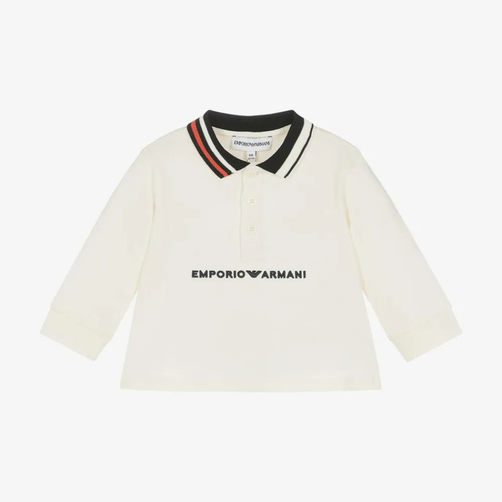 An ivory cotton polo shirt for baby boys by Emporio Armani. Made in soft jersey, this comfortable, long-sleeved top has the Italian label's logo embroidered on the front in navy blue for a distinctive look. It has a ribbed collar with contrasting red and navy blue stripes, and fastens with branded buttons on the front.