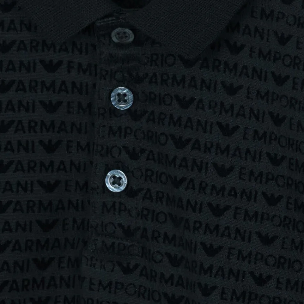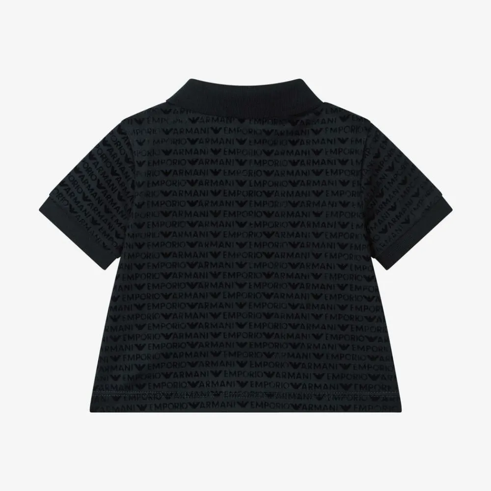 A navy blue polo shirt for baby boys by Italian brand Emporio Armani, made in a soft and comfortable lyocell and cotton blend jersey. Designed with a subtle sheen, this stylish top has flocked repeat logos printed all over. It has short sleeves and a ribbed collar and cuffs for a classic look and fastens with branded buttons on the front.