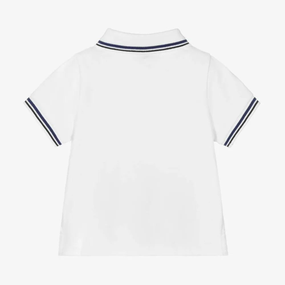 Baby boys white polo shirt by Emporio Armani, made in soft cotton piqué. This short-sleeved top has navy blue and black stripes on the ribbed collar and cuffs. Instantly recognisable, the signature black rubberised Eagle logo can be seen on the chest.
