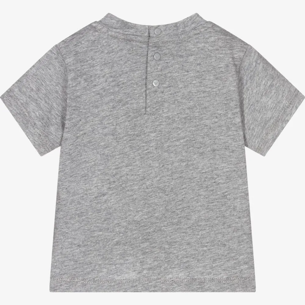 Little boys grey marl T-shirt from Emporio Armani, made in super soft and stretchy cotton jersey. This short-sleeved top has a bold white Eagle logo printed on the front for instant recognition and branded popper fastenings on the back.