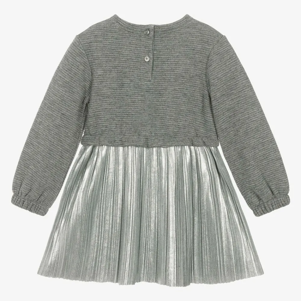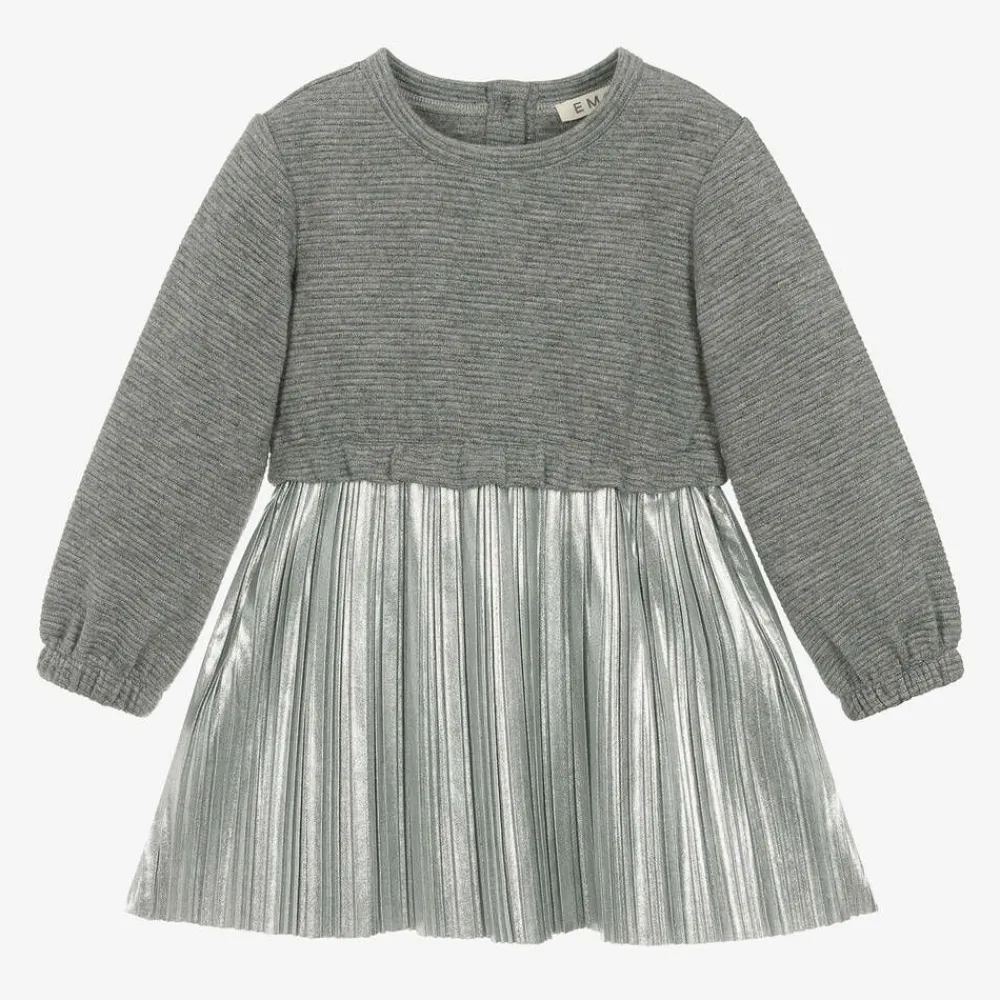 A silver dress for girls by Everything Must Change, with the appearance of a two-piece. Glistening with silver thread, the top part of the dress is made in a soft ribbed jersey knit. It has elasticated cuffs on the long sleeves, a ruffle trimming the waist and button fastenings on the back. Finely pleated and made in a lightweight viscose blend, the metallic silver skirt adds a stylish finish to a casual design.