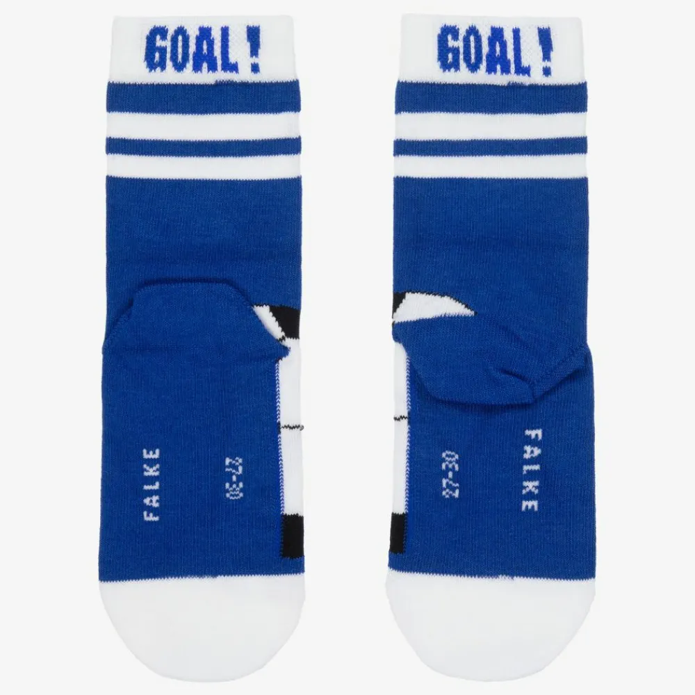 Blue socks for boys by Falke, made in a soft and stretchy, moisture wicking viscose blend. They have a football on each foot and blue and white striped trims on the cuffs with the word 'Goal'.