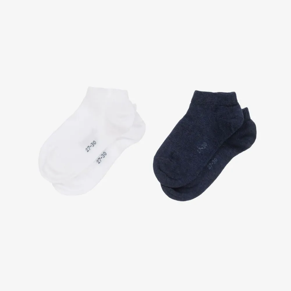 Two pairs of trainer socks for boys and girls by Falke, made in a soft, cotton rich blend with ribbed cuffs. Comfortable for everyday wear, one pair is navy blue and the other is white.