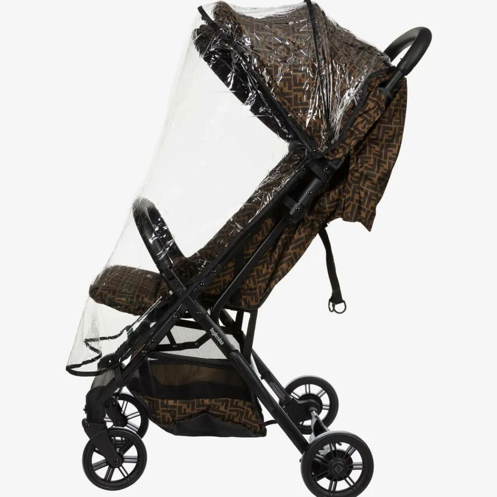 Luxury baby stroller by Fendi, with signature brown FF logo print. It is lightweight and super compact when folded, ideal for stowing in the overhead compartment of an airplane. The back rest can be reclined to a flat position, and the foot rest is adjustable making it suitable for children from birth to approximately age 3. It has a full cover hood with UPF50+ protection and a net ventilation insert.