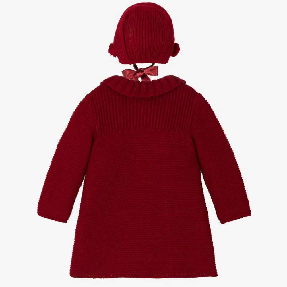 Traditional dark red knitted pram coat and bonnet set for little girls by classic Spanish brand Foque. The coat has a chunky, ribbed collar and a ribbed bodice. There are white, double-breasted button fastenings on the front and cute pom-pom detailing on one side. It comes with a coordinating bonnet that has a ribbed trim, pom-poms on the sides and satin ribbon ties to fasten.