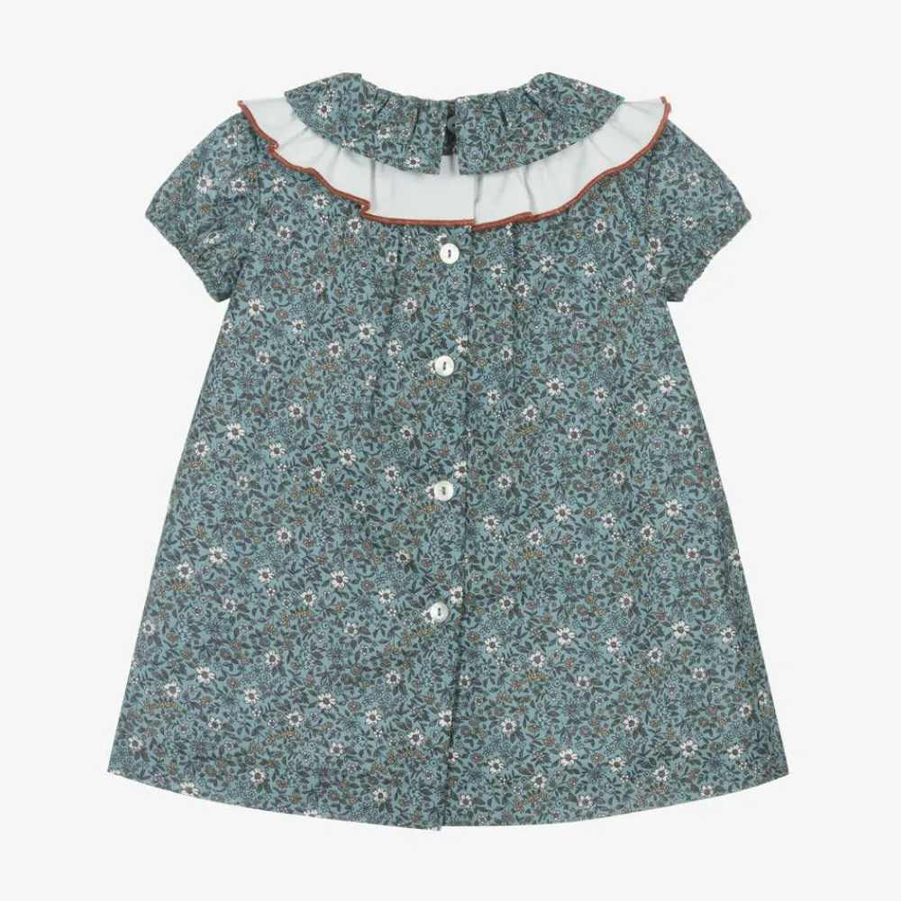 Exclusive to Childrensalon, a lovely blue dress for little girls by Spanish brand Foque, with a white and yellow floral print. Made in lightweight poplin, it has a ruffled collar with a white twill ruffle below, trimmed in russet brown. A fixed, russet brown velvet bow and iridescent logo charm give a sweet finishing touch. The dress has gently elasticated cuffs on the sleeves and wide pleats on the front and back. It fastens with mother-of-pearl buttons on the back and is fully lined in voile for comfort.
