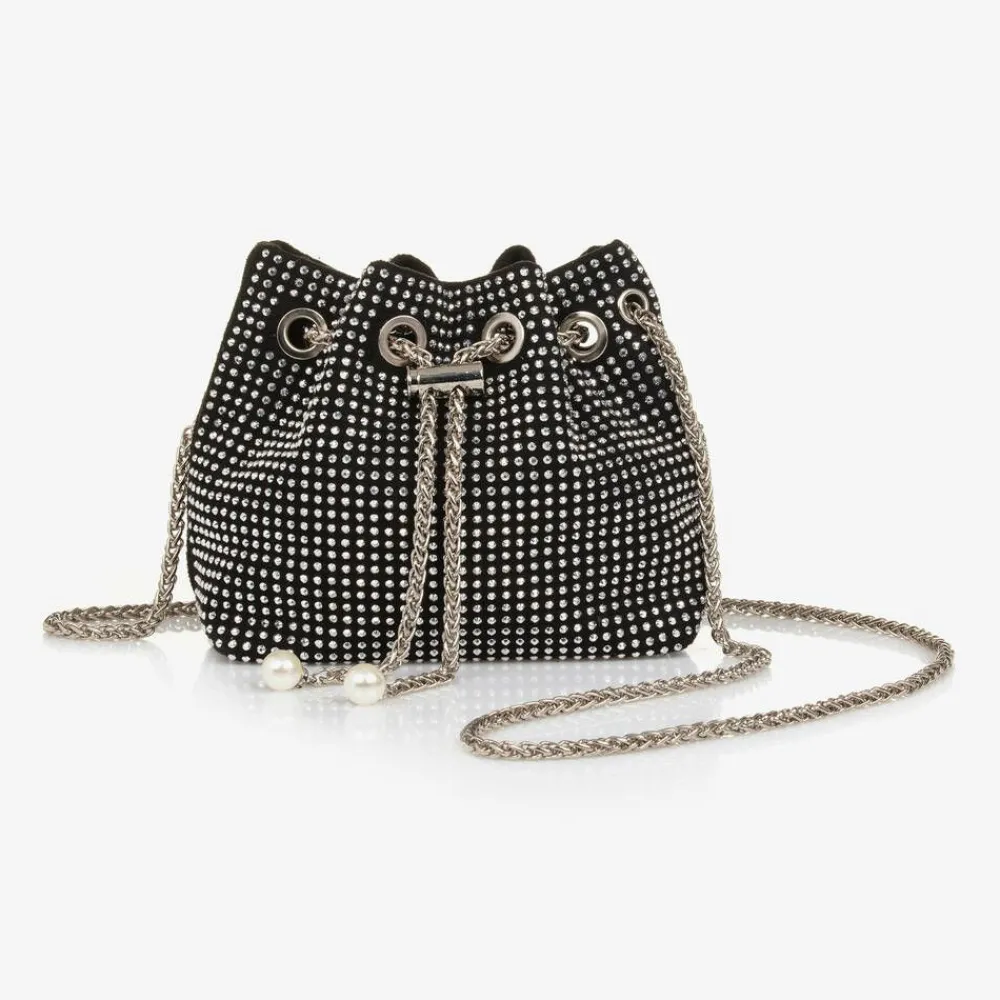 Edgey black handbag for girls by Fun & Fun. The felted fabric is embellished with diamantés and the compartment secures closed with a chain drawstring fastening which matches the detachable strap.
