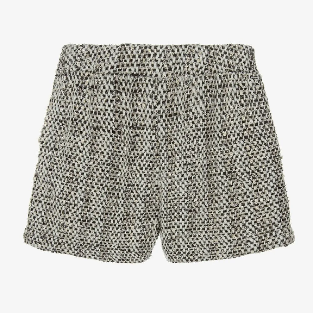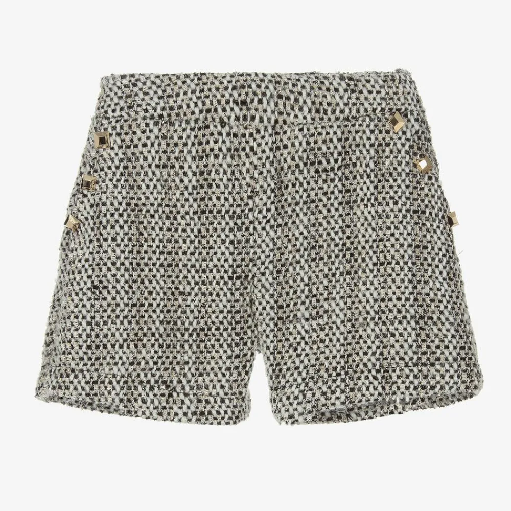 Black and ivory shorts for older girls from H.Love by Fun & Fun. They are made from soft tweed, woven with shiny gold and silver tinsel-like thread for a touch of sparkle. Fastening with a discreet zip on one side, they have slanted pockets with gold-tone stud detailing for a cool finish.