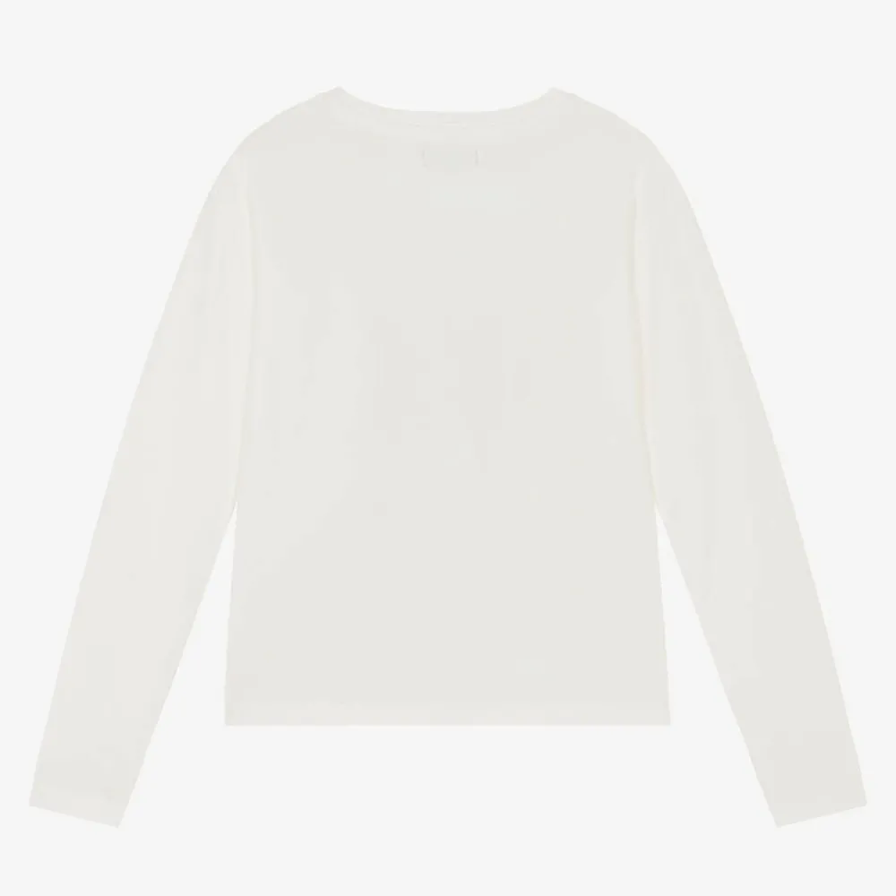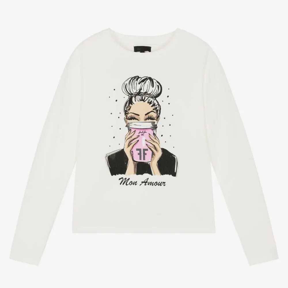 A lovely ivory top for older girls by Fun & Fun, made in soft and stretchy cotton jersey. A useful layering piece, this long-sleeved design has a diamanté-trimmed stylish girl print with a pink coffee cup, logo details and the words, 'Mon Amour'.